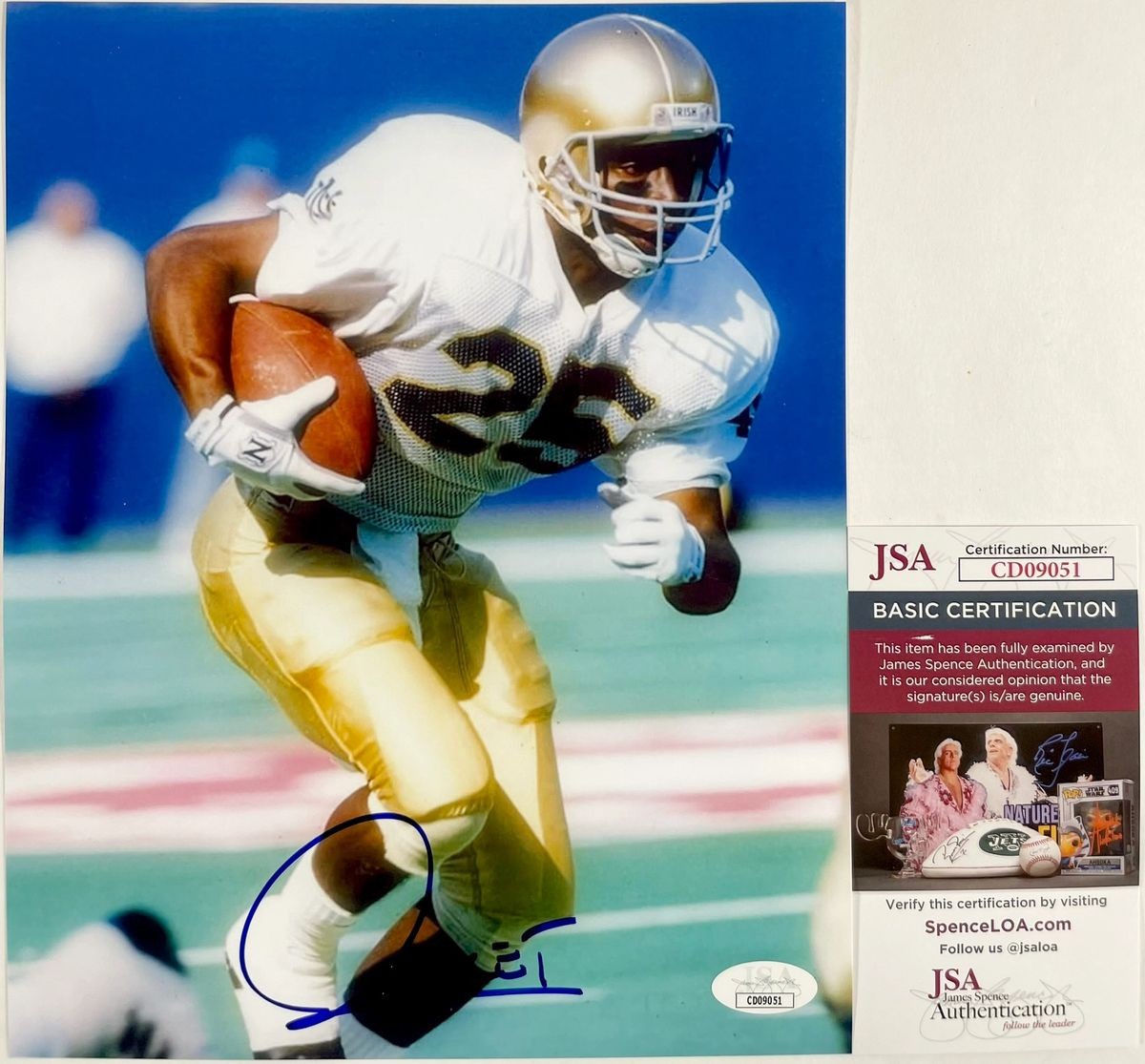 Professionally printed 8×10 photo, hand signed in person by former NFL Wide Receiver, Raghib “Rocket” Ismail. Rocket played his college career at Notre Dame before being drafted in the fourth round of the 1991 NFL Draft, Over his NFL career, Rocket played for the Los Angeles / Oakland Raiders, the Carolina Panthers, and the Dallas Cowboys. This is a clean, well placed signature, signed in a flowing Blue Sharpie that really pops off of this crisp, professionally printed 8×10 photo. A clear plastic 8×10 toploader is included with purchase to safely ship the photo inside of. Item has been authenticated by James Spence Authentications, one of the most reputable third-party authentication companies in the world and includes the JSA Certificate of Authenticity card.