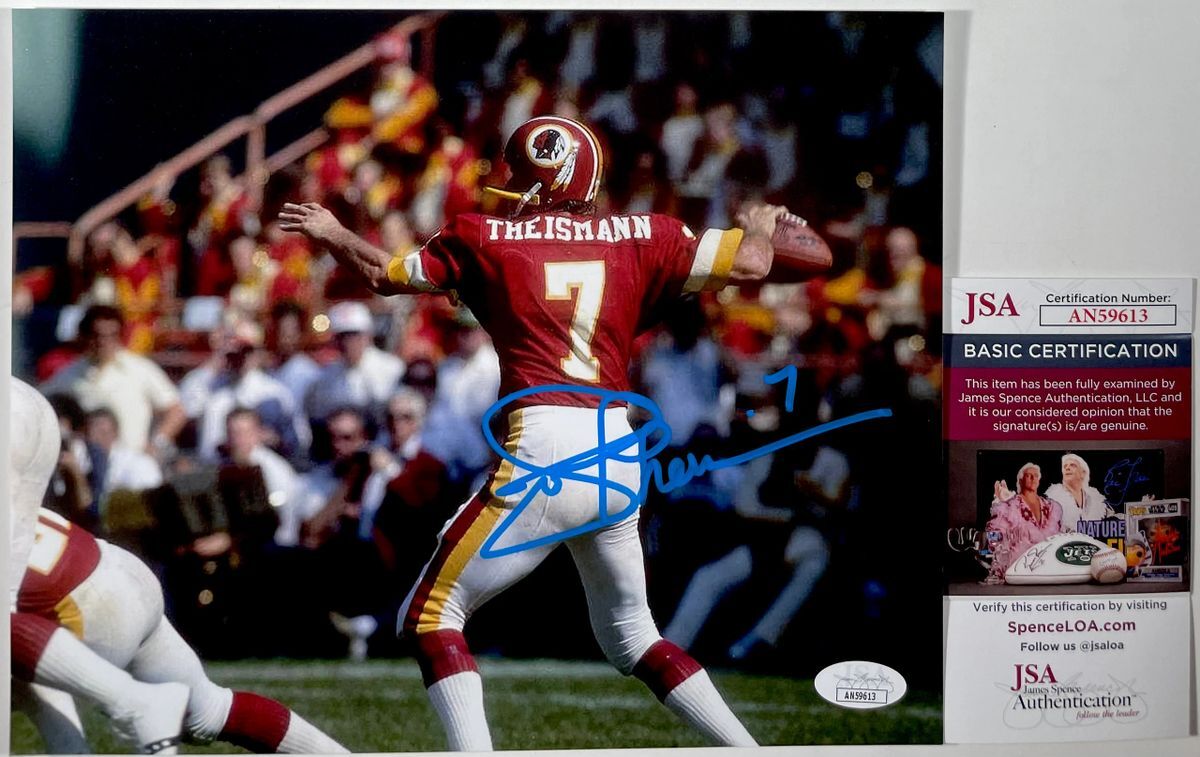 Professionally printed 8×10 photo, hand signed in person by 1983 NFL MVP and Super Bowl XVII Champion as Quarterback for the Washington Redskins, Joe Theismann. Mr. Theismann played his college career at Notre Dame before being drafted in the fourth round of the 1971 NFL Draft by the Miami Dolphins. However Theismann chose to play three seasons in Canada before joining the Washington Redskins in the 1974 season. This is a clean, well placed signature, signed in a flowing Blue 2 MM Decco paint pen that really pops off of this crisp, professionally printed 8×10 photo. Item has been authenticated by James Spence Authentications, and includes the JSA Certificate of Authenticity card. JSA COA# AN59613