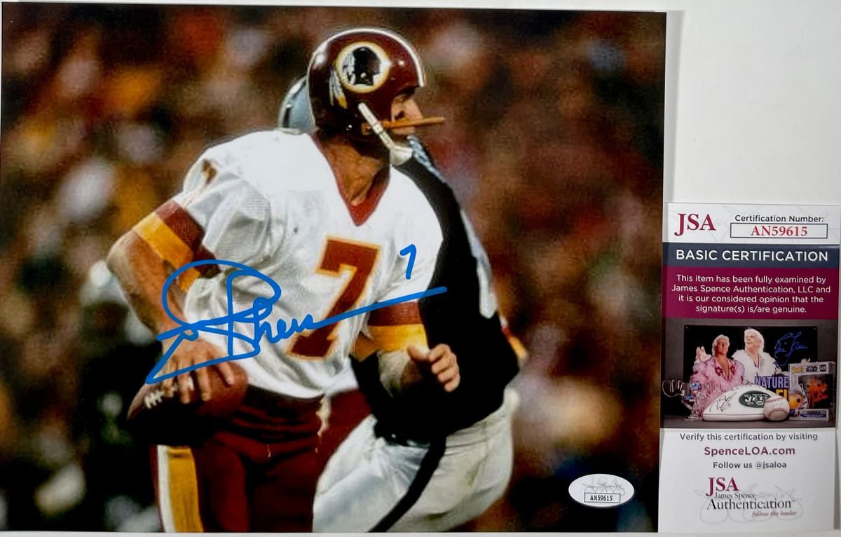 Professionally printed 8×10 photo, hand signed in person by 1983 NFL MVP and Super Bowl XVII Champion as Quarterback for the Washington Redskins, Joe Theismann. Mr. Theismann played his college career at Notre Dame before being drafted in the fourth round of the 1971 NFL Draft by the Miami Dolphins. However Theismann chose to play three seasons in Canada before joining the Washington Redskins in the 1974 season. This is a clean, well placed signature, signed in a flowing Blue 2 MM Decco paint pen that really pops off of this crisp, professionally printed 8×10 photo. Item has been authenticated by James Spence Authentications, and includes the JSA Certificate of Authenticity card. JSA COA# AN59615