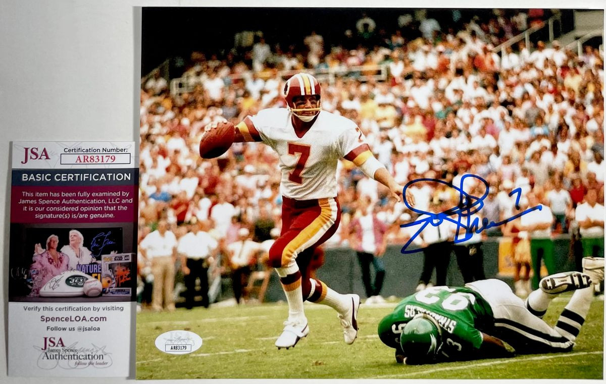 Professionally printed 8×10 photo, hand signed in person by 1983 NFL MVP and Super Bowl XVII Champion as Quarterback for the Washington Redskins, Joe Theismann. Mr. Theismann played his college career at Notre Dame before being drafted in the fourth round of the 1971 NFL Draft by the Miami Dolphins. However Theismann chose to play three seasons in Canada before joining the Washington Redskins in the 1974 season. This is a clean, well placed signature, signed in a flowing Blue Sharpie that really pops off of this crisp, professionally printed 8×10 photo. Photo will ship inside of a clear plastic toploader. Item has been authenticated by James Spence Authentications, one of the most reputable third-party authentication companies in the world and includes the JSA Certificate of Authenticity card.