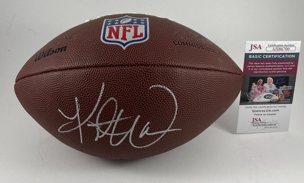 Wilson “The Duke” Official NFL Football Replica, hand signed by NFL Hall of Fame Quarterback Kurt Warner. Kurt won the Superbowl XXXIV MVP, leading the St. Louis Rams to the victory. Kurt would return to the Superbowl two more times. One more time as a Ram, and later as the Quarterback for the Arizona Cardinals. This is a clean, well placed large signature, signed in a flowing Silver Paint Pen that really pops off of The Duke. Item has been authenticated by James Spence Authentications, and includes the JSA Certificate of Authenticity card.