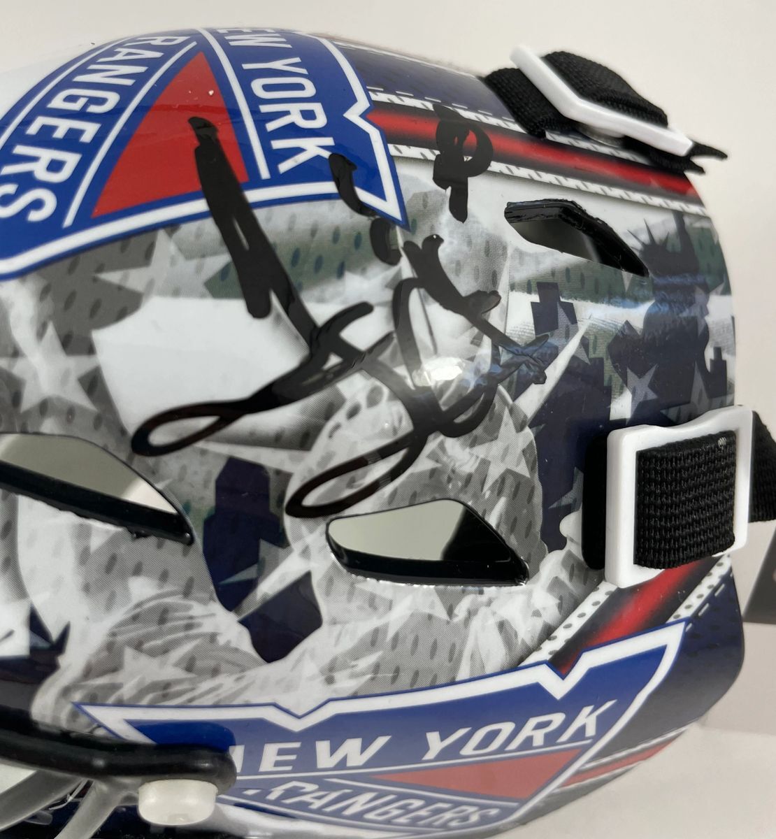 NHL Franklin New York Rangers Mini Goalie Helmet, hand signed by New York Rangers Hall Of Fame Goalie, Henrik Lundqvist. This is a clean, well placed signature, signed in a flowing Black 2 MM Decco Paint Pen that really pops off of this NHL Franklin New York Rangers Mini Goalie Helmet. Item has been authenticated by James Spence Authentications, and includes the JSA Certificate of Authenticity card. JSA COA# AM22036