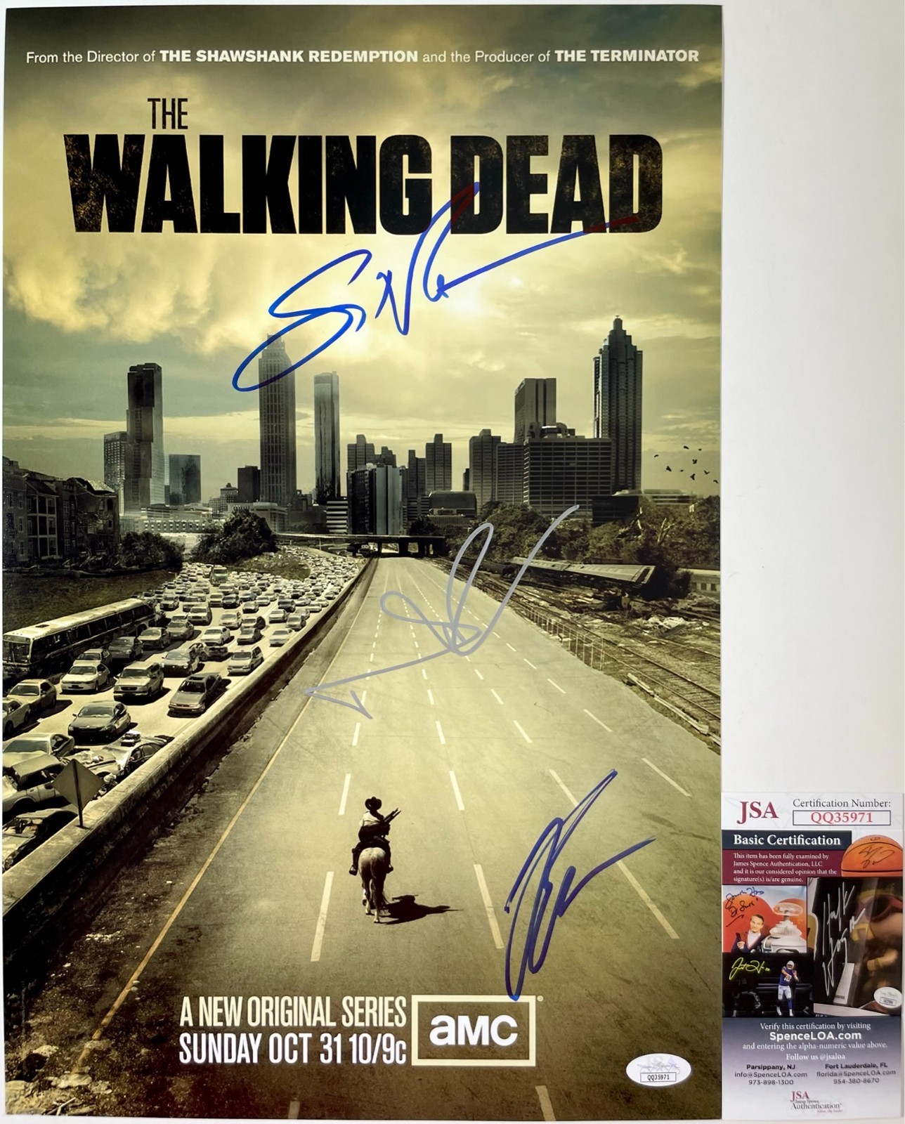 This is three clean, well placed signatures that really pop off of this crisp, professionally printed The Walking Dead Season One 11×17 poster. A clear plastic 11×17 toploader is included with purchase to safely ship the Poster inside of. Item has been authenticated by James Spence Authentications, one of the most reputable third-party authentication companies in the world, and includes the JSA Certificate of Authenticity card.