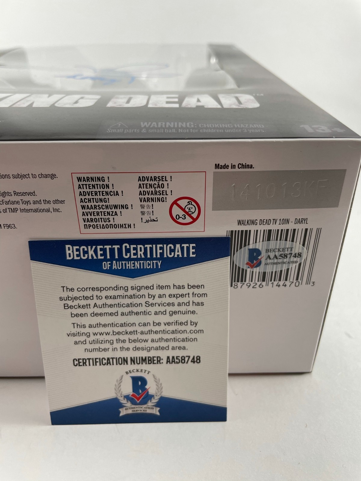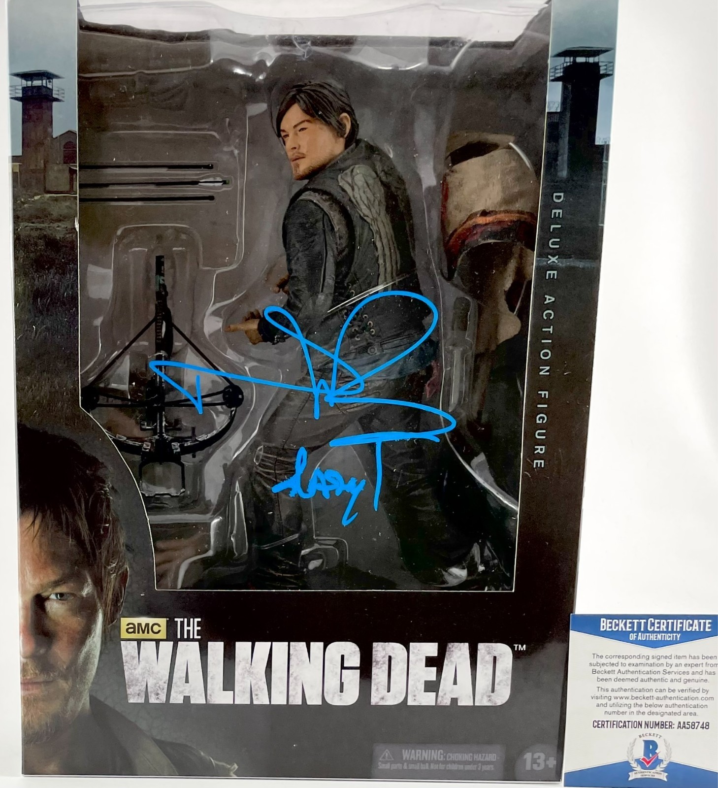 AMC The Walking Dead Daryl Dixon 10″ McFarlane Figure, hand signed in person by actor Norman Reedus who played the role of Daryl Dixon on the hit AMC Television series The Walking Dead. This is a clean, well placed signature with character name “Daryl” inscription, signed in a flowing Blue 2MM DECCO Paint Pen that really pops off of the plastic. Item has been authenticated by Beckett Authentication Services, one of the most reputable third-party authentication companies in the world, and includes the Beckett Certificate of Authenticity card.
