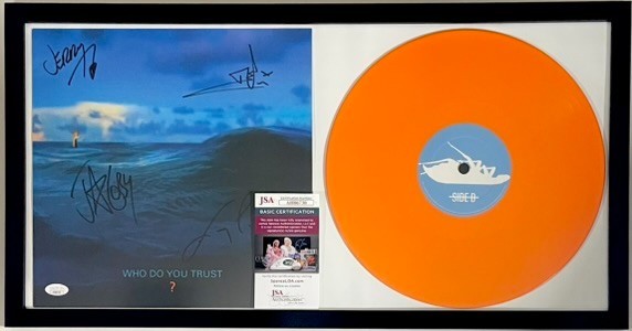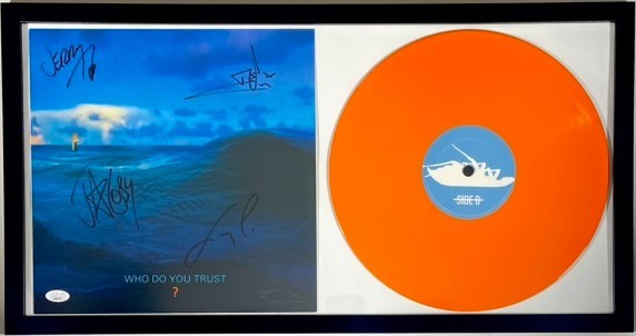 This is four clean, perfectly placed signatures, signed in a matching, flowing, Black Sharpie that really pops off of this Papa Roach “Who Do You Trust” 12×12 Album Cover Art Card. Both the signed Who Do You Trust Insert Card and Vinyl LP Record have been mounted inside of this sleek, ready to hang, framed display. Item has been authenticated by James Spence Authentication, one of the most reputable third-party authentication companies in the world, and includes the JSA Certificate Of Authenticity card.