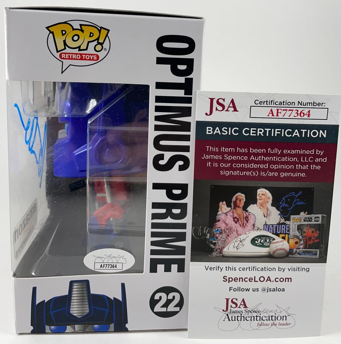 Transformers Optimus Prime Amazon Exclusive Funko POP #22, hand signed by voice actor Peter Cullen who is credited as the voice of Optimus Prime in the original Transformers television series as well as a number of the films. This is a clean, well placed signature, signed in a flowing Blue 2 MM Decco paint pen that really pops off of the plastic. Item was witnessed being signed by James Spence Authentications, and includes the JSA Certificate of Authenticity card. JSA COA# AF77364