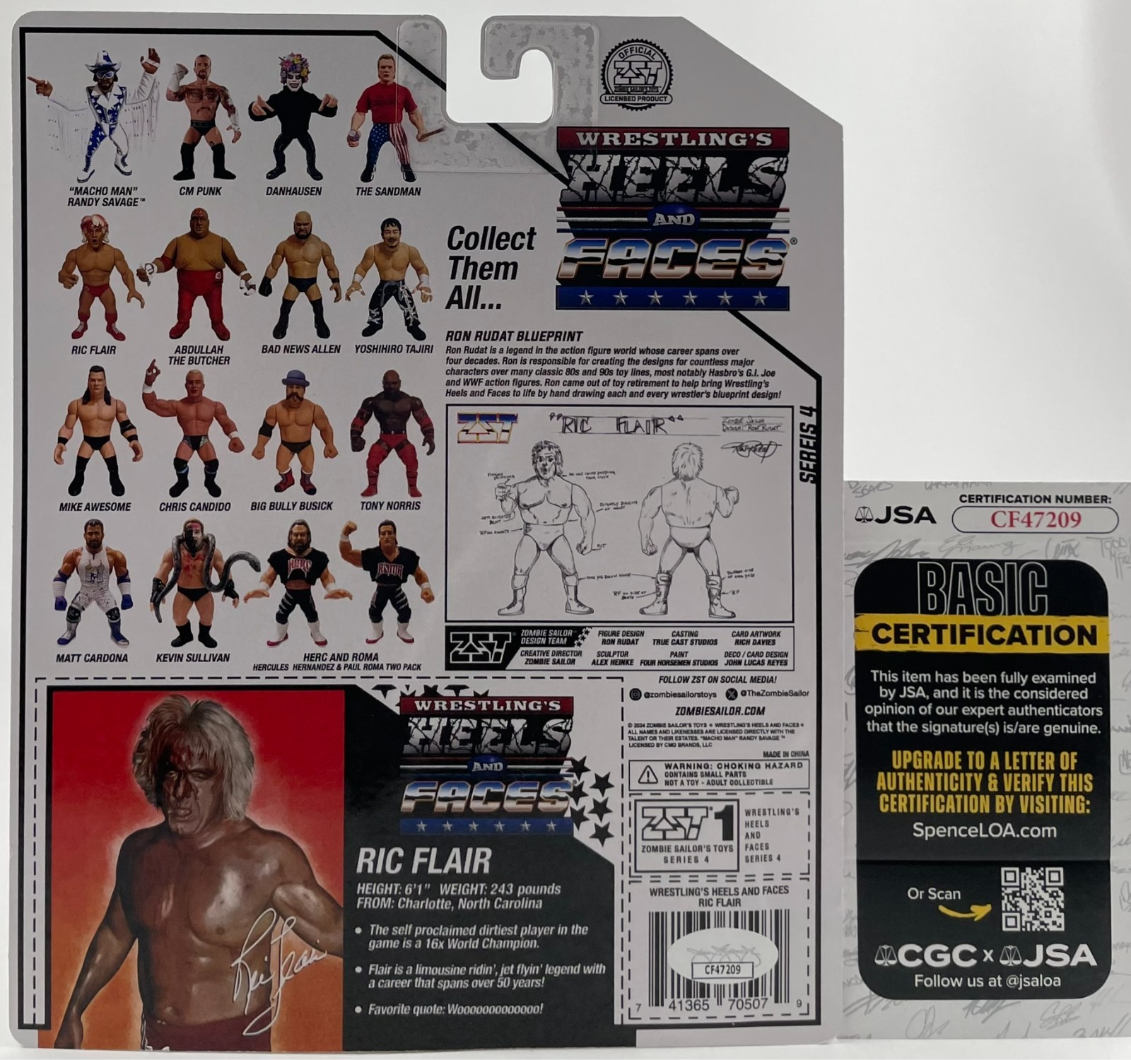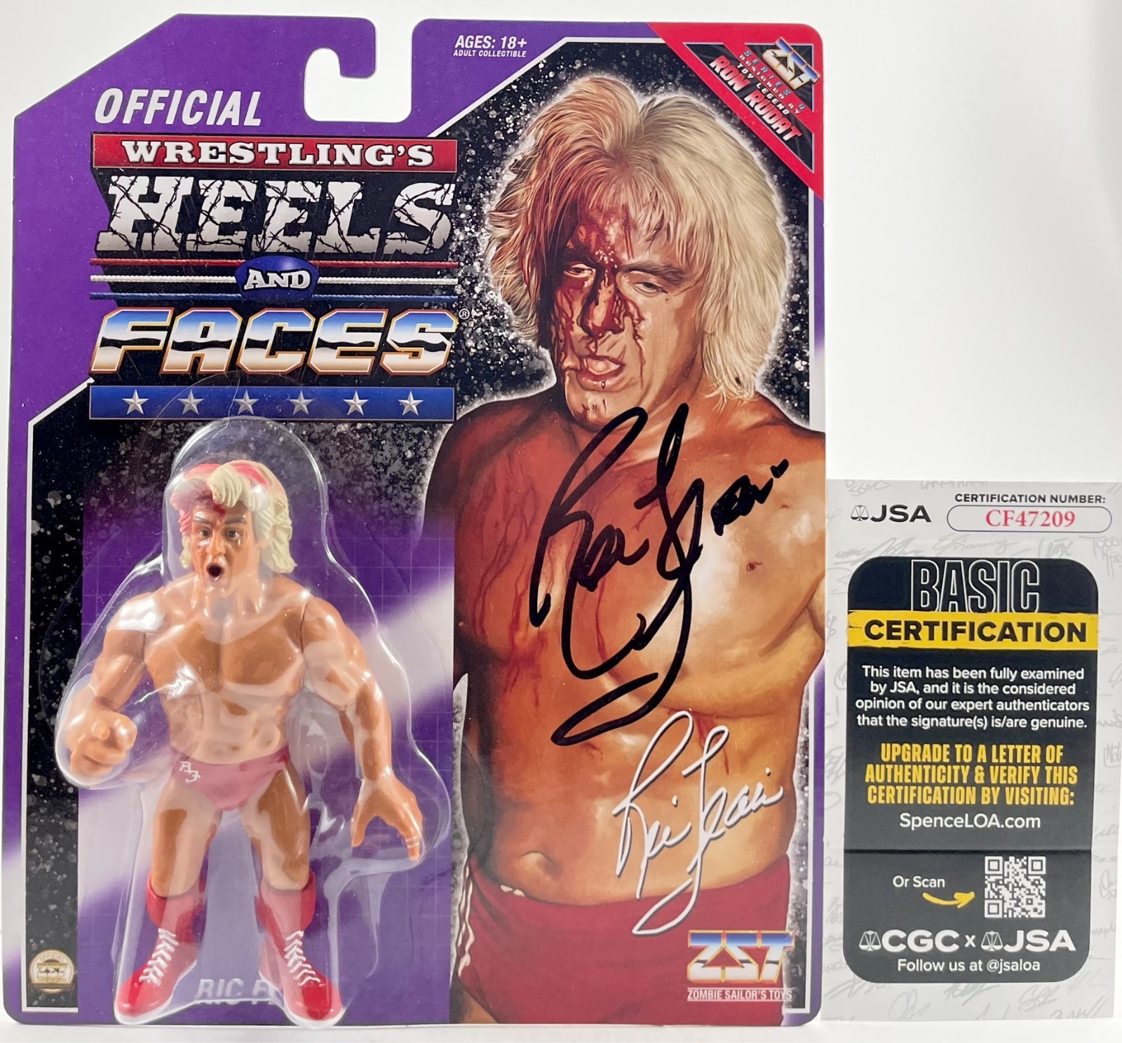 Zombie Sailor Toys (ZST) Official Wrestling’s Heels And Faces Series Four Bloody Ric Flair Wrestling Figure, hand signed in person by wrestling Icon, the sixteen-time World Heavyweight Champion, the “Nature Boy” Ric Flair. This Zombie Sailor Toys Official Wrestling’s Heels And Faces style of figure is comparable to the current WWE Mattel Retro Figures and the old WWF Hasbro Figure line. This is a clean, perfectly placed signature, signed in a flowing Black Sharpie that really pops off of the card of this Zombie Sailor Toys Official Wrestling’s Heels And Faces Series Four Figure. Item has been authenticated by James Spence Authentication, one of the most reputable third-party authentication companies in the world, and includes the JSA Certificate Of Authenticity card.