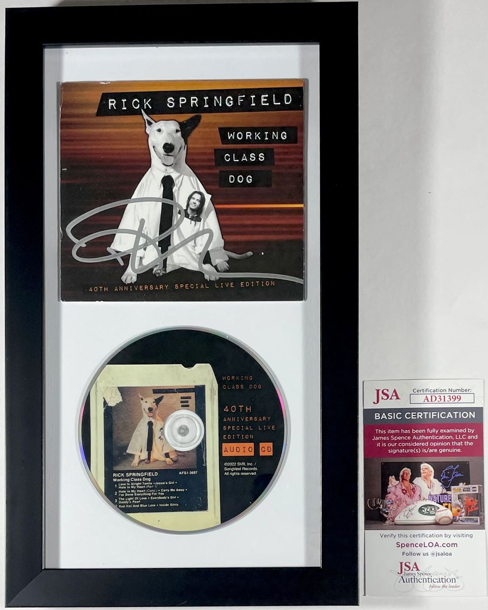 Rick Springfield “Working Class Dog” CD and signed CD Cover, hand signed in person by legendary Rock & Roll Musician Rick Springfield of Jessie’s Girl fame. This is a clean, well paced signature, signed in a flowing Silver that really pops off of this signed Rick Springfield “Working Class Dog” CD Cover, inside of this amazing framed and matted display which includes the CD. Item has been authenticated by James Spence Authentications, one of the most reputable third-party authentication companies in the world and includes the JSA Certificate Of Authenticity card.
