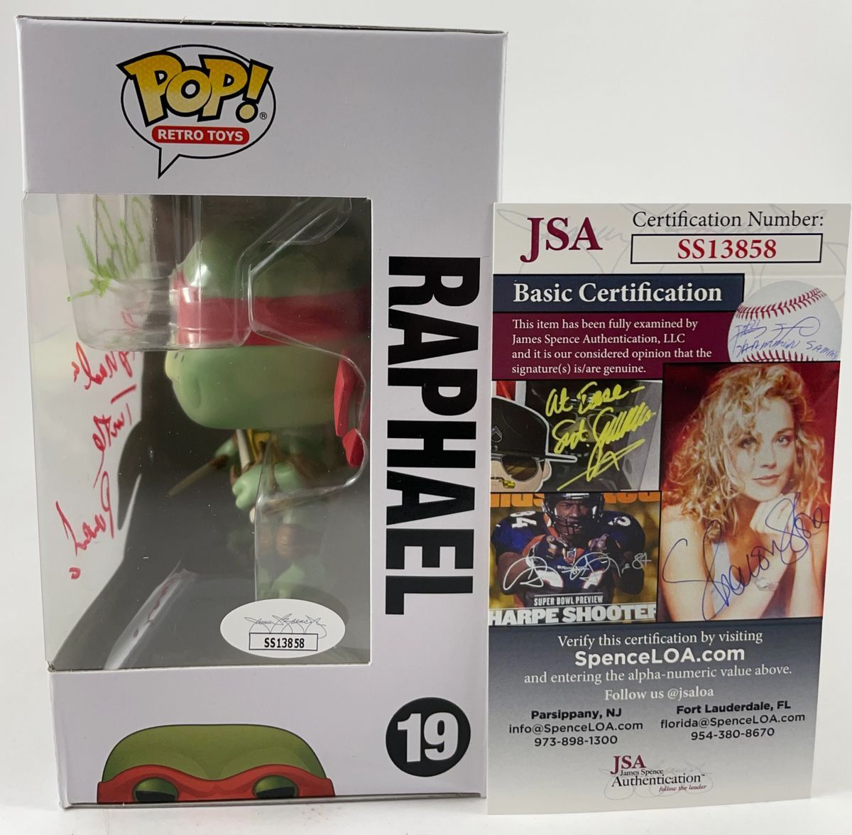 Teenage Mutant Ninja Turtles Raphael Funko POP! Vinyl Figure #19, hand signed in person by voice actor Rob Paulsen who is known for his work as the voice of the original Raphael Ninja Turtle on the hit animated Television Series, Teenage Mutant Ninja Turtles. This is a clean, well placed signature, signed in a flowing Green 2MM Decco Paint Pen that really pops off of the plastic. Rob also added his character name “Raphael” and the “Turtle Power” inscription in a flowing Red 2MM Molotow paint pen. The dual colors, and multiple inscriptions is a great touch, really setting this Funko POP! apart from the rest. Item has been authenticated by James Spence Authentications, one of the most reputable third party authentication companies in the world, and includes the JSA Certificate of Authenticity card.