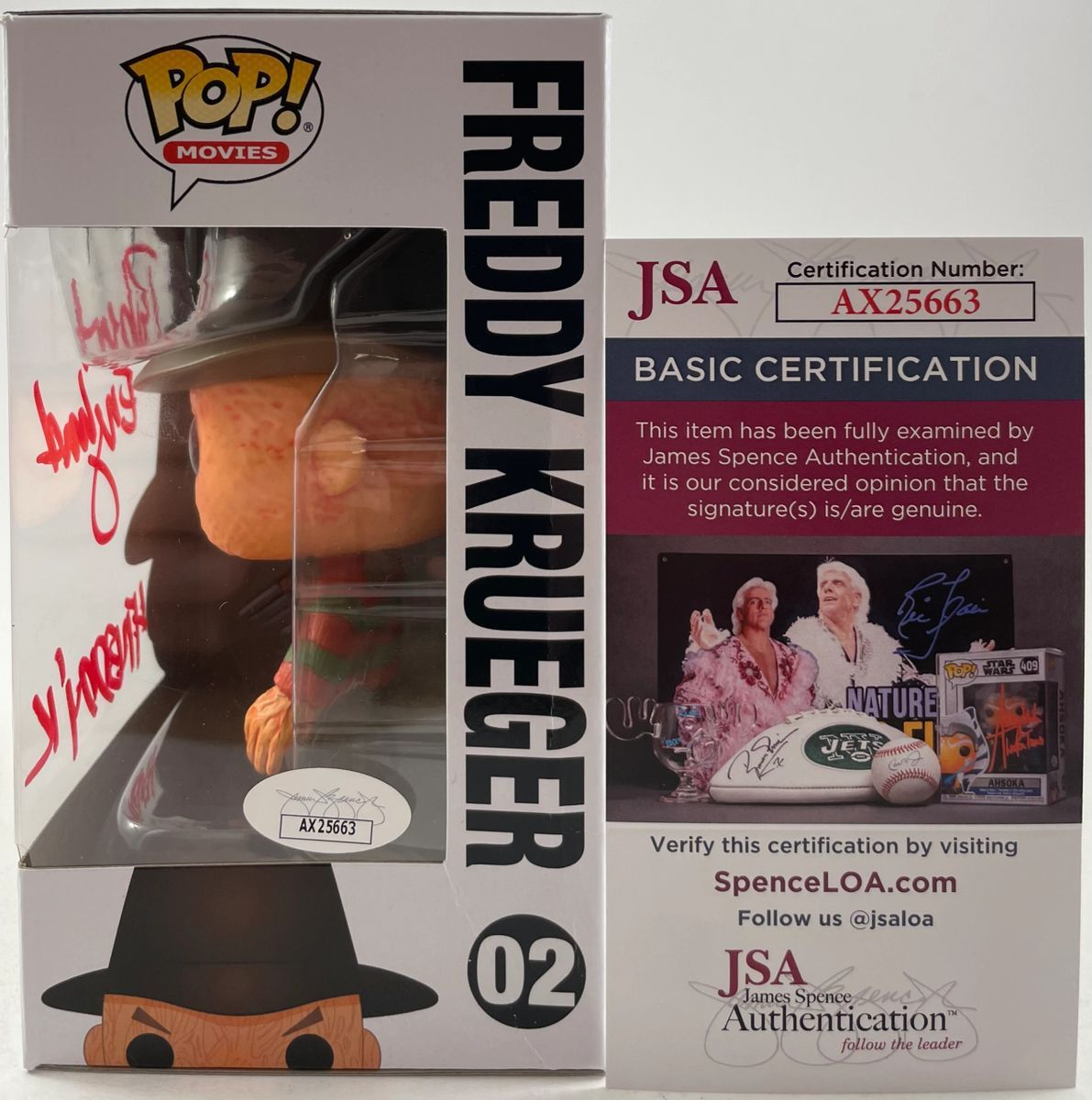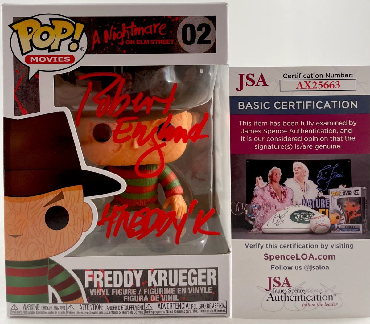 A Nightmare On Elm Street Freddy Krueger Funko POP! Vinyl Figure #02, hand signed in person by Horror Icon Robert Englund who played the role of Freddy Krueger in the popular Horror franchise, A Nightmare On Elm Street. This is a clean, well placed signature, with character name “Freddy K” inscription, signed in a flowing Red 2MM Molotow paint pen that really pops off of the plastic. Item has been authenticated by James Spence Authentications, one of the most reputable third-party authentication companies in the world and includes the JSA Certificate of Authenticity card. JSA COA# AX25663