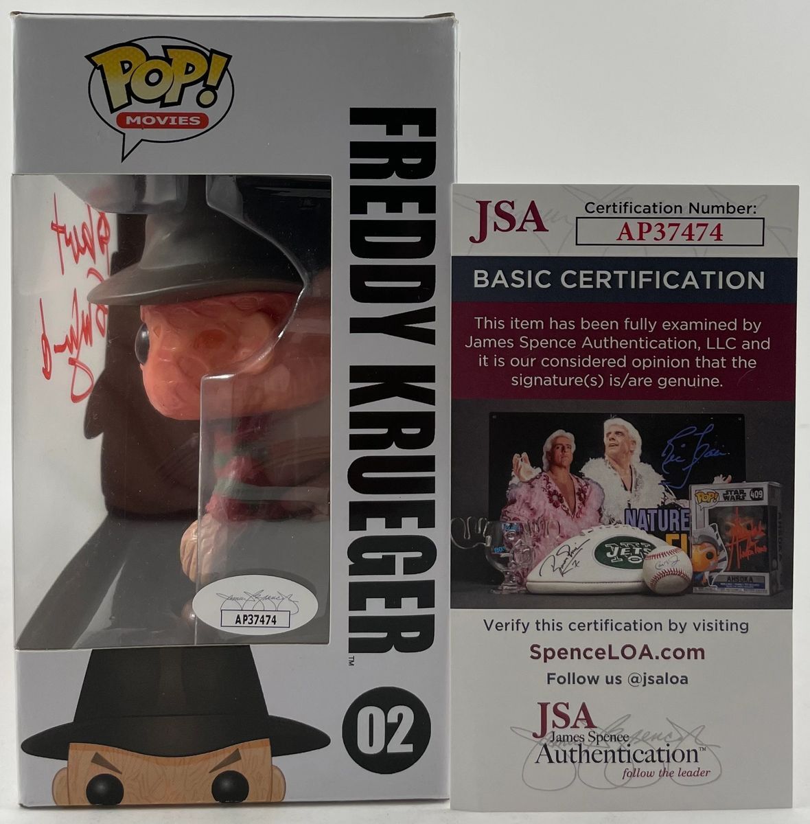 A Nightmare On Elm Street Freddy Krueger Funko POP #02, hand signed in person by actor Robert Englund who played the role of Freddy Krueger in the popular Horror franchise, A Nightmare On Elm Street. This is a clean, well placed signature, signed in a flowing Red 2 MM Molotow paint pen that really pops off of the plastic. Item has been authenticated by James Spence Authentications, and includes the JSA Certificate of Authenticity card. JSA COA# AP37474