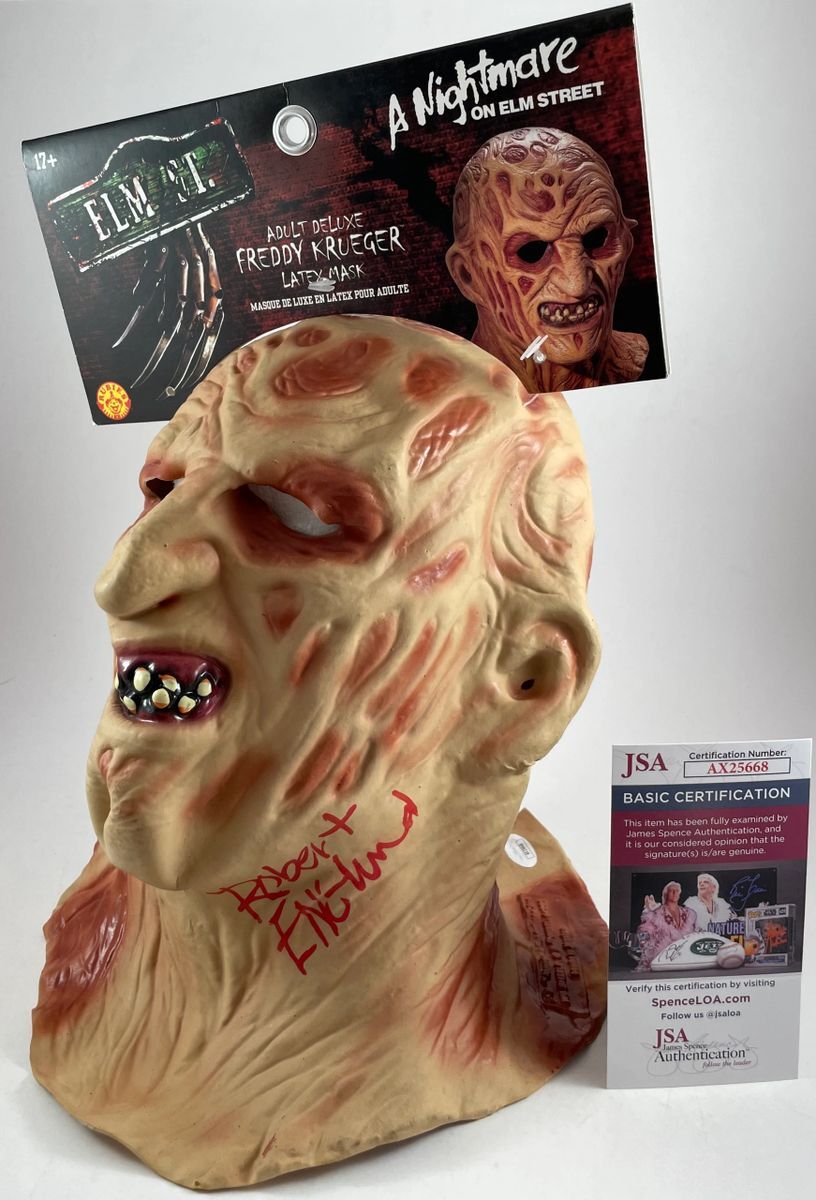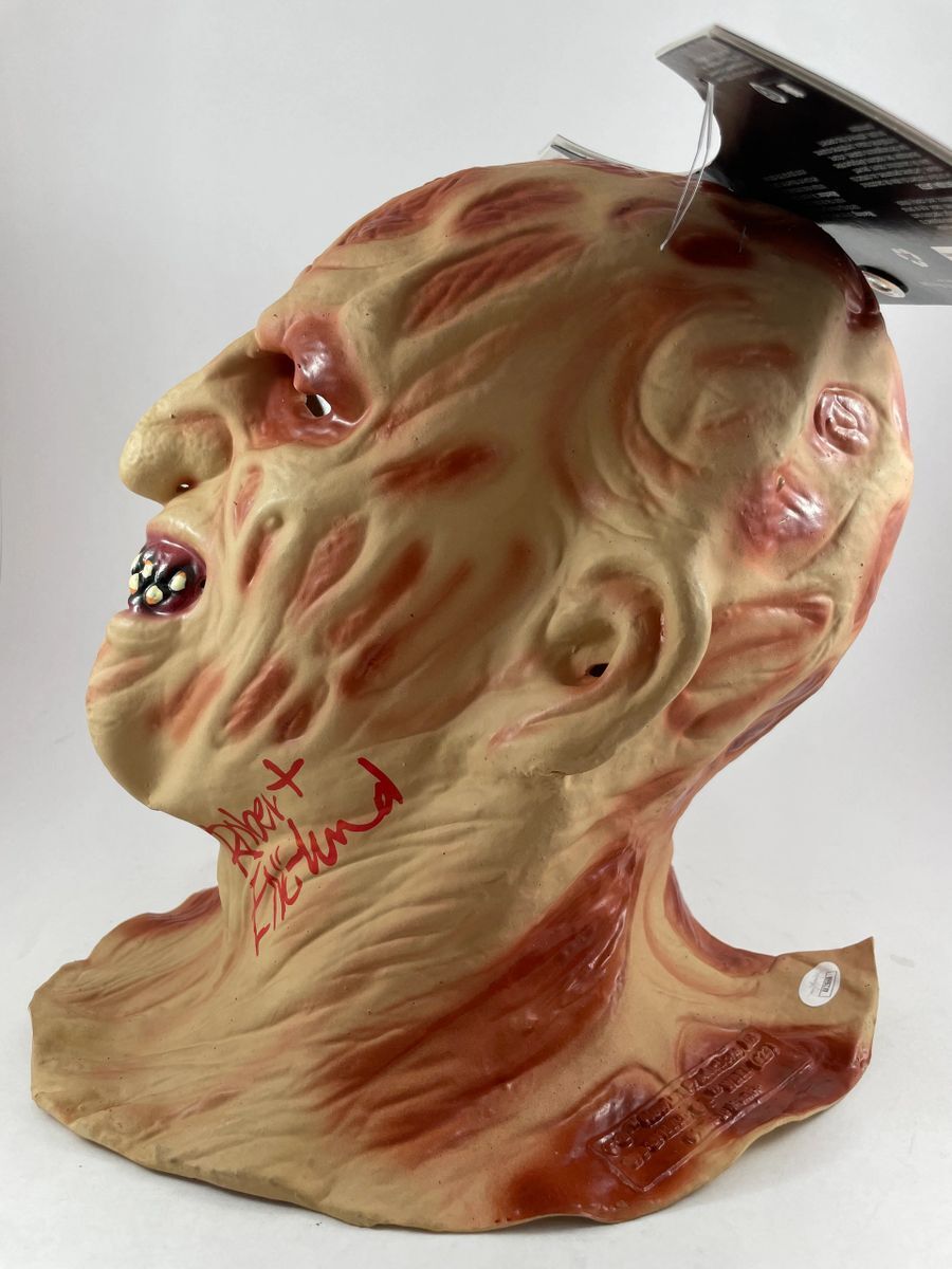 A Nightmare On Elm Street Freddy Krueger Adult Deluxe Replica Latex Mask, hand signed in person by Horror Icon Robert Englund who played the role of Freddy Krueger in the A Nightmare On Elm Street films. This is a clean, well placed signature, signed in a flowing Red 2MM Molotow paint pen that really pops off of this Adult Deluxe Replica Freddy Kreuger Latex Mask. Item has been authenticated by James Spence Authentications, one of the most reputable third-party authentication companies in the world and includes the JSA Certificate Of Authenticity card.