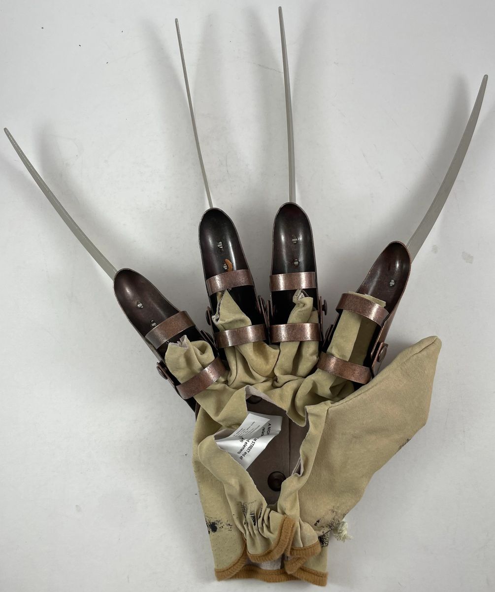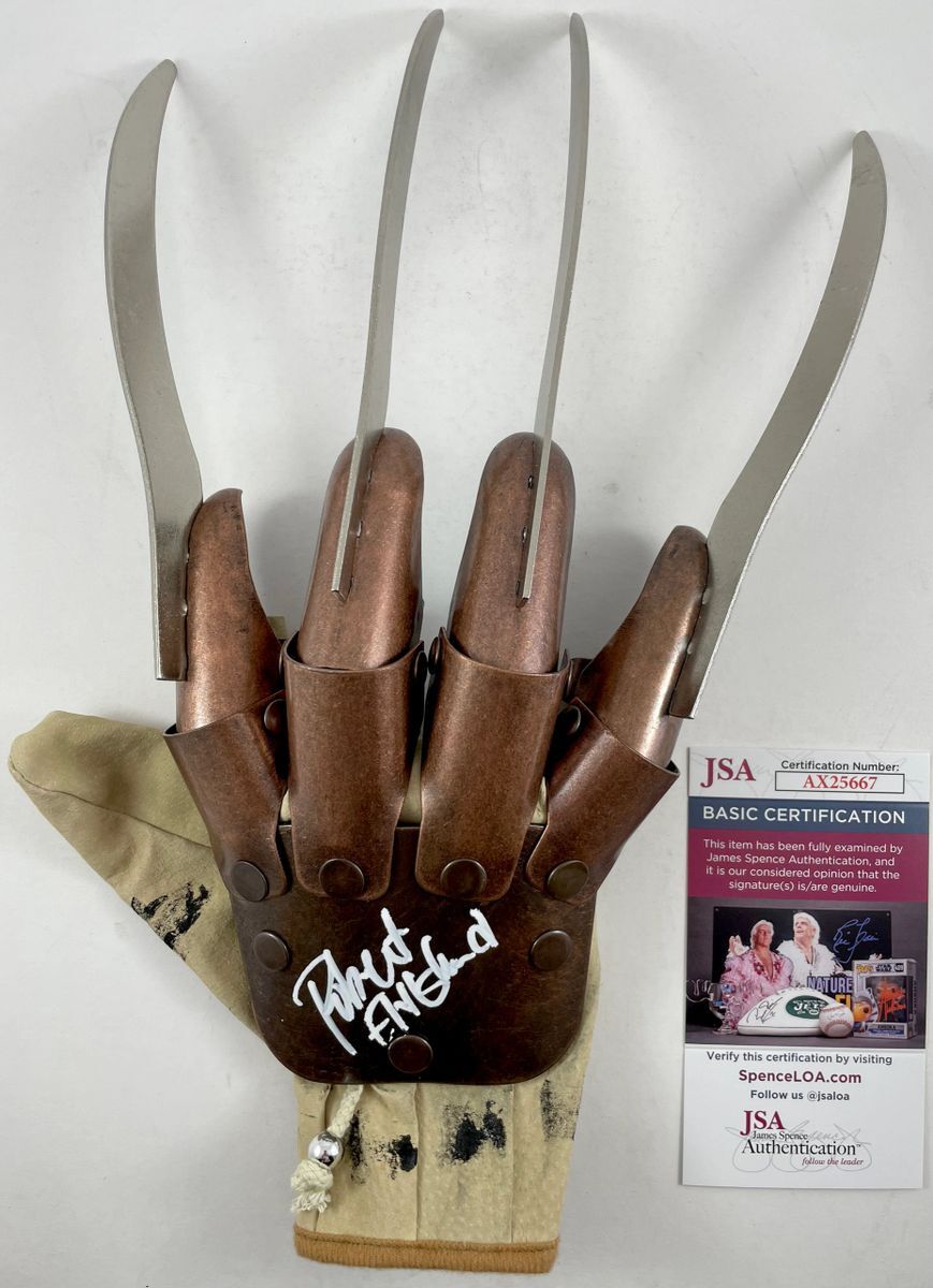 A Nightmare On Elm Street Freddy Krueger Supreme Edition Replica Metal Glove, hand signed in person by Horror Icon Robert Englund who played the role of Freddy Krueger in the A Nightmare On Elm Street films. This is a clean, well placed signature, signed in a flowing White 2MM Molotow paint pen that really pops off of the top of this Medal Freddy Krueger Supreme Edition Replica Glove. Item has been authenticated by James Spence Authentications, one of the most reputable third-party authentication companies in the world and includes the JSA Certificate Of Authenticity card.