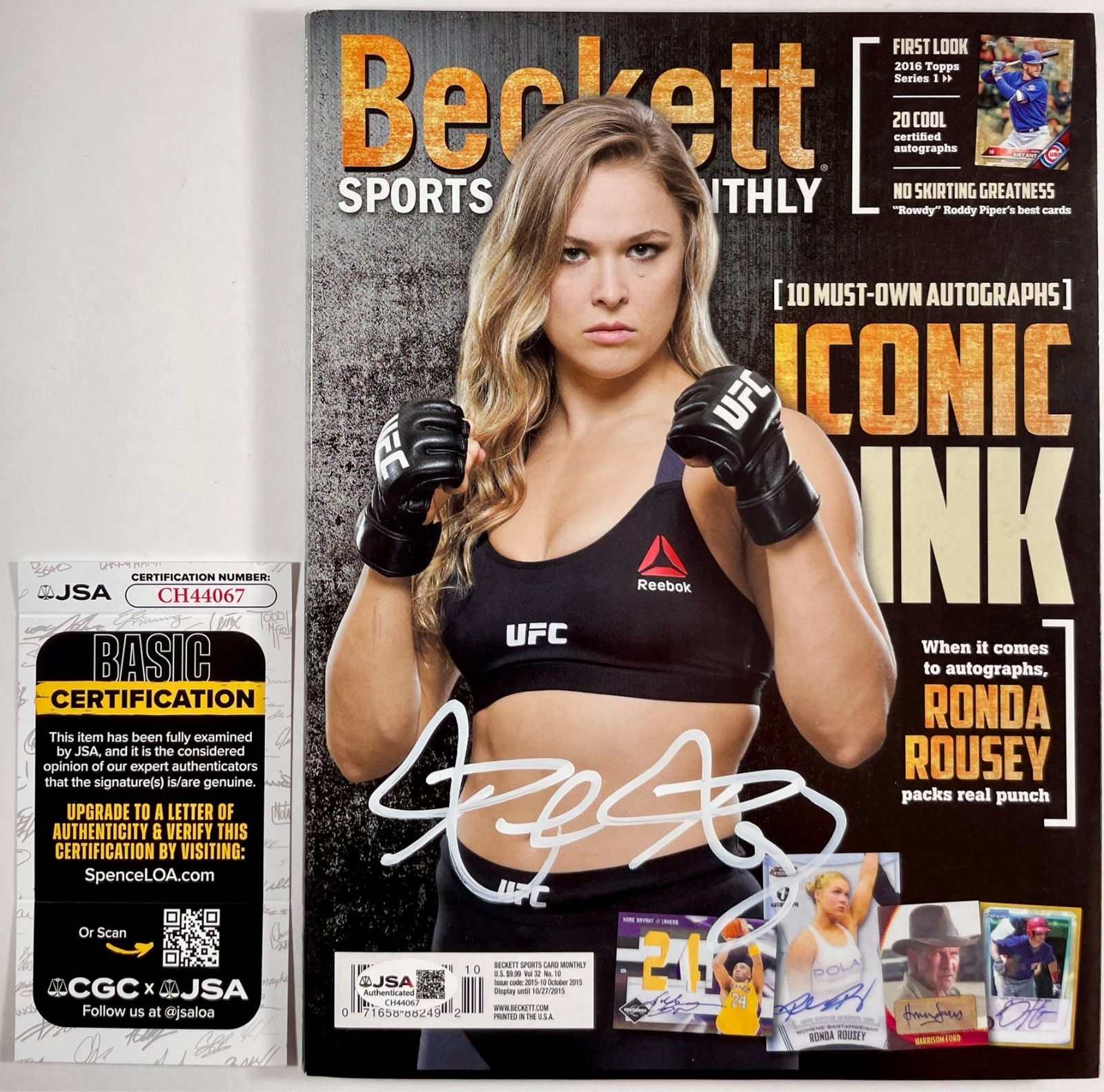 Beckett Sports Monthly Magazine Vol 32 No. 10 October 2015 Issue, hand signed in person by inaugural UFC Women’s Bantamweight Champion, the Baddest Woman On The Planet, “Rowdy” Ronda Rousey. After her departure from the UFC, Ronda signed with the WWE, where she would go on to win the WWE Women’s World Championship three times. This is a clean, well placed signature, signed in a flowing, thick White DECCO Paint Pen that really pops off of this Beckett Sports Monthly October 2015 Magazine Cover. Magazine will ship inside of the same clear bag and white board it has been stored in since the day it was signed. Item has been authenticated by James Spence Authentications, one of the most reputable third-party authentication companies in the world, and includes the JSA Certificate of Authenticity card.