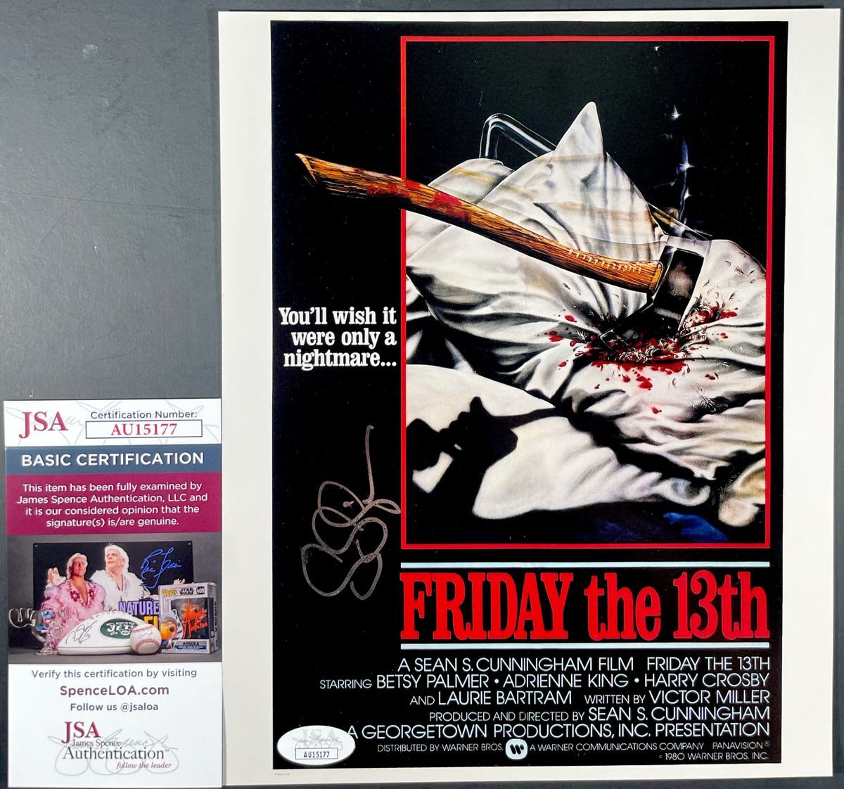 Professionally printed Friday The 13th 8×10 Mini Movie Poster Photo, hand signed in person by multi talented Writer, Director, and Producer Sean S. Cunningham who produced and directed the original Friday The 13th film. This is a well placed signature, signed in a flowing Silver that really pops off of this crisp, professionally printed 8×10 photo. Item has been authenticated by James Spence Authentications, one of the most reputable third party authentication companies in the world, and includes the JSA Certificate Of Authenticity card.
