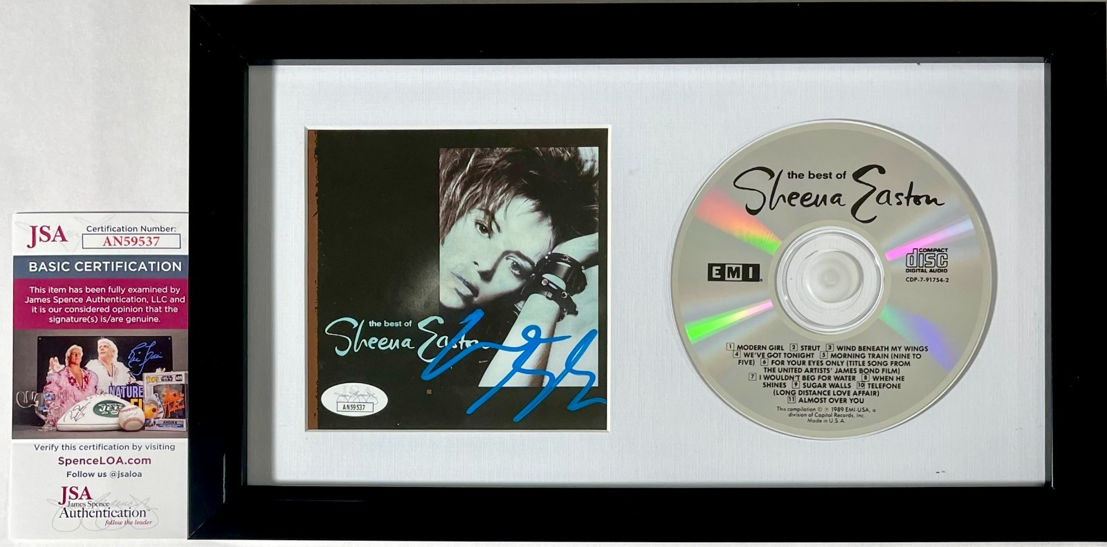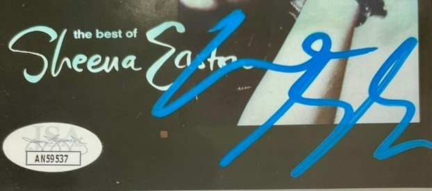 Sheena Easton “The Best Of Sheena Easton” CD and signed CD Booklet, hand signed in person by two-time Grammy Award winning artist, Sheena Easton. This is a clean, well paced signature, signed in a flowing Blue 2MM DECCO Paint Pen that really pops off of this Sheena Easton signed “The Best Of Sheena Easton” CD Booklet. The signed “The Best Of Sheena Easton” CD Booklet and CD have been mounted inside of this sleek, ready to hang, framed and matted display. Item has been authenticated by James Spence Authentication, one of the most reputable third-party authentication companies in the world, and includes the JSA Certificate Of Authenticity card.