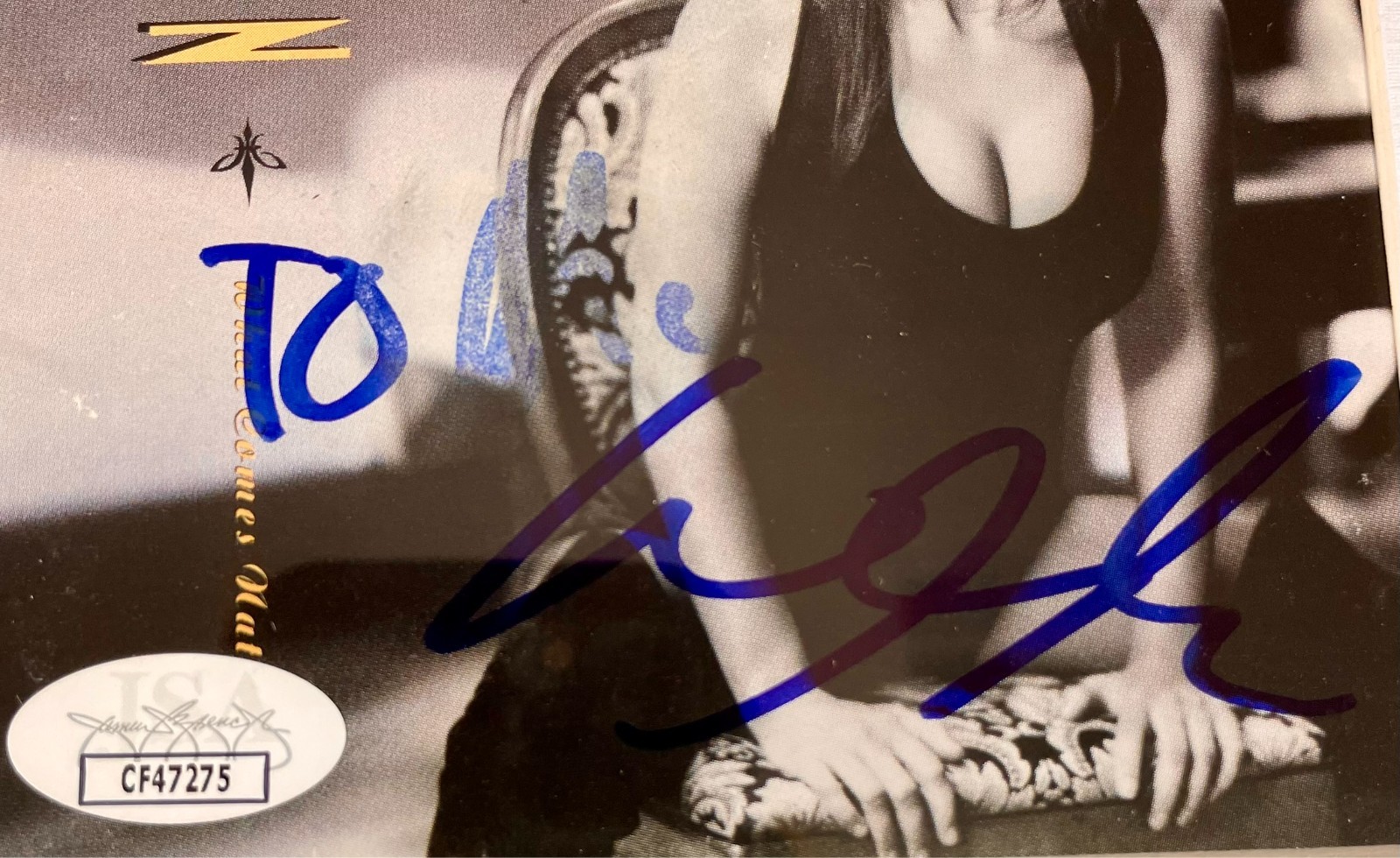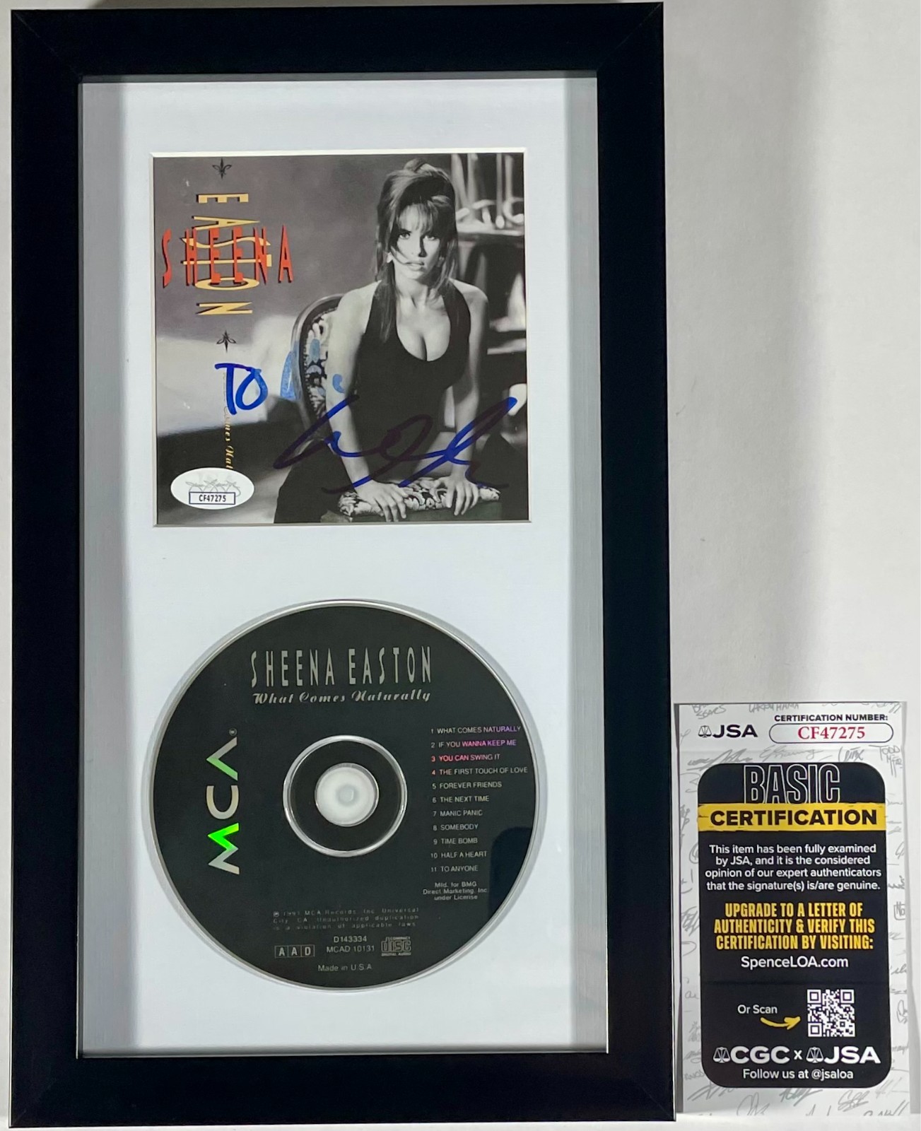 Sheena Easton “What Comes Naturally” CD and signed CD Booklet, hand signed in person by two-time Grammy Award winning artist, Sheena Easton. This is a clean, well paced signature, signed in a flowing Blue Sharpie that really pops off of this Sheena Easton signed “What Comes Naturally” CD Booklet. The signed “What Comes Naturally” CD Booklet and CD have been mounted inside of this sleek, ready to hang, framed and matted display. Personalization was attempted to be removed unsuccessfully. Item has been authenticated by James Spence Authentication, one of the most reputable third-party authentication companies in the world, and includes the JSA Certificate Of Authenticity card.