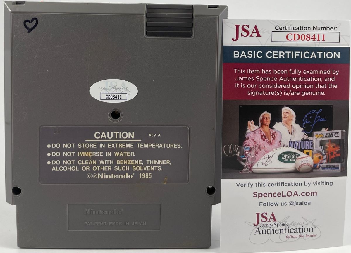 Sesame Street 123 Original Nintendo (NES) Video Game Cartridge, hand signed in person by actress Sonia Manzano who played the role of Maria on the popular children’s Television Series Sesame Street. Cartridge has two games on it including Astro-Grover and Ernie’s Magic Shapes. This is a clean, well placed signature, signed in a flowing Black Sharpie that really pops off of the cover of this Sesame Street 123 NES Cartridge. Item has been authenticated by James Spence Authentications, one of the most reputable third-party authentication companies in the world and includes the JSA Certificate of Authenticity card.