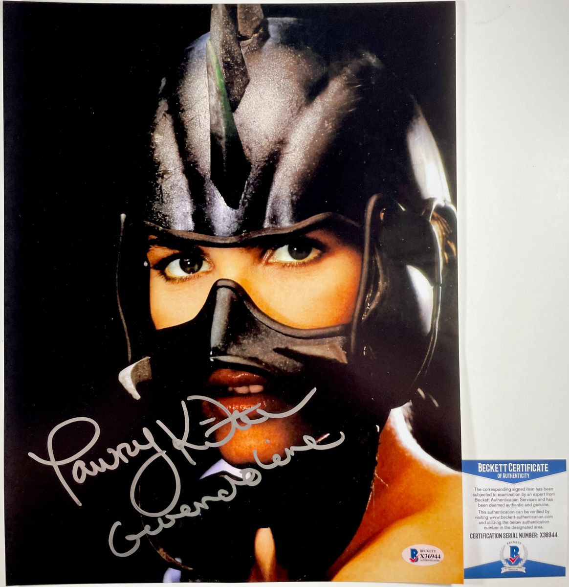Professionally printed 11×14 photo, hand signed in person by late great actress Tawny Kitaen who played the role of Gwendoline in the 1984 film The Perils Of Gwendoline in the Land of the Yik Yak. This is a clean, well placed signature, with character name “Gwendoline” inscription, signed in a flowing Silver Recollections that really pops off of this crisp, professionally printed 11×14 photo. Photo will ship inside of a clear plastic top loader. Item has been authenticated by Beckett Authentication Services, one of the most reputable third-party authentication companies in the world and includes the Beckett Certificate of Authenticity card.