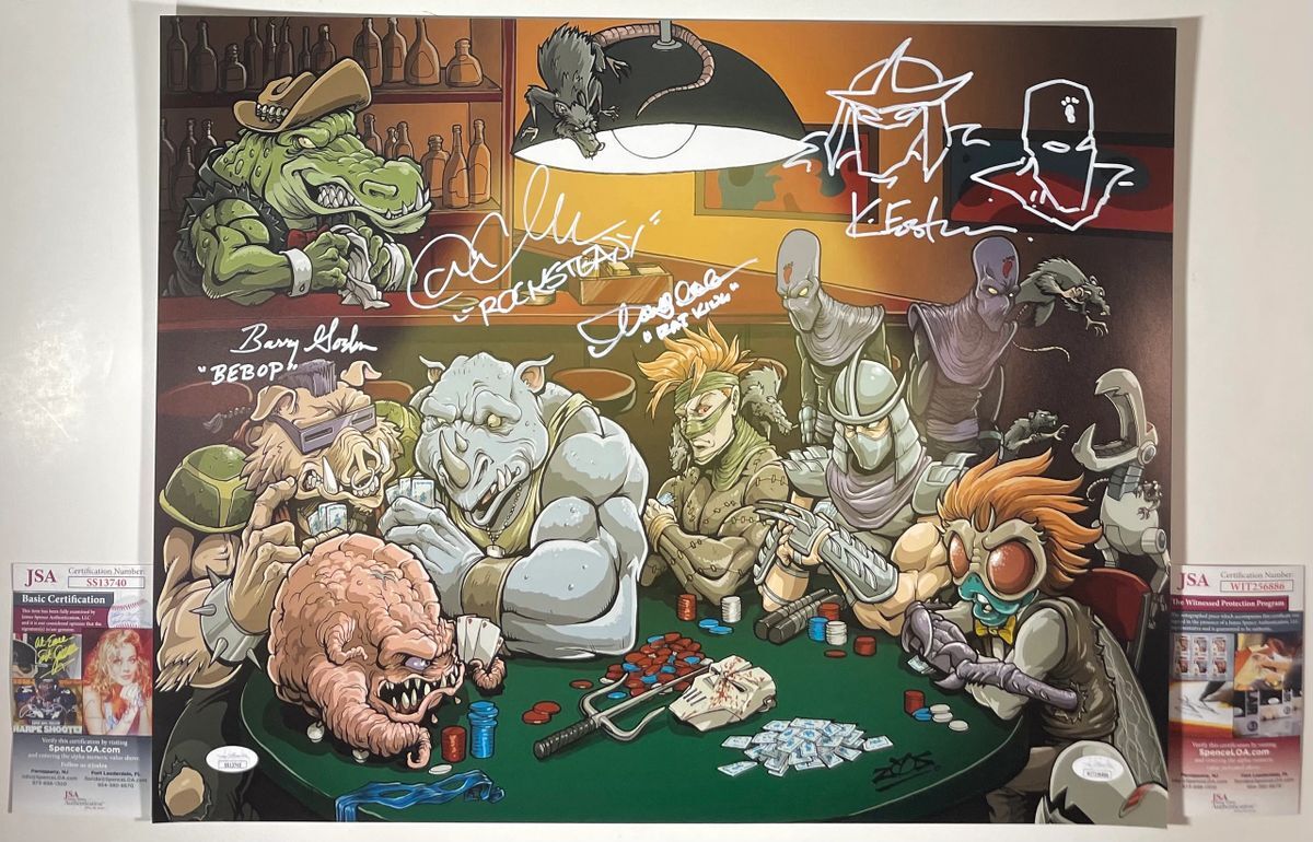 Professionally printed Teenage Mutant Ninja Turtles 16×20 photo, hand signed by four members of the cast, including Teenage Mutant Ninja Turtles creator Kevin Eastman and voice actors Barry Gordon, Cam Clarke, and Townsend Coleman. All four talents signed in a matching White 2 MM paint pen that really pops off of this crisp, professionally printed 16×20. After signing Mr. Eastman added dual sketches of Shredder and Foot Soldier which really put this piece over the top. Barry Gordon signed and added character name “Bebop”, Cam Clarke signed and added character name “Rocksteady”. Townsend Coleman signed and added character name “Rat King”. Item is dual authenticated with the Mr. Eastman signature and dual sketches being witnessed by JSA and includes the JSA Witness certificate of authenticity card. The Barry Gordon, Cam Clarke, and Townsend Coleman signatures were authenticated by JSA, and include the basic JSA certificate of authenticity card.