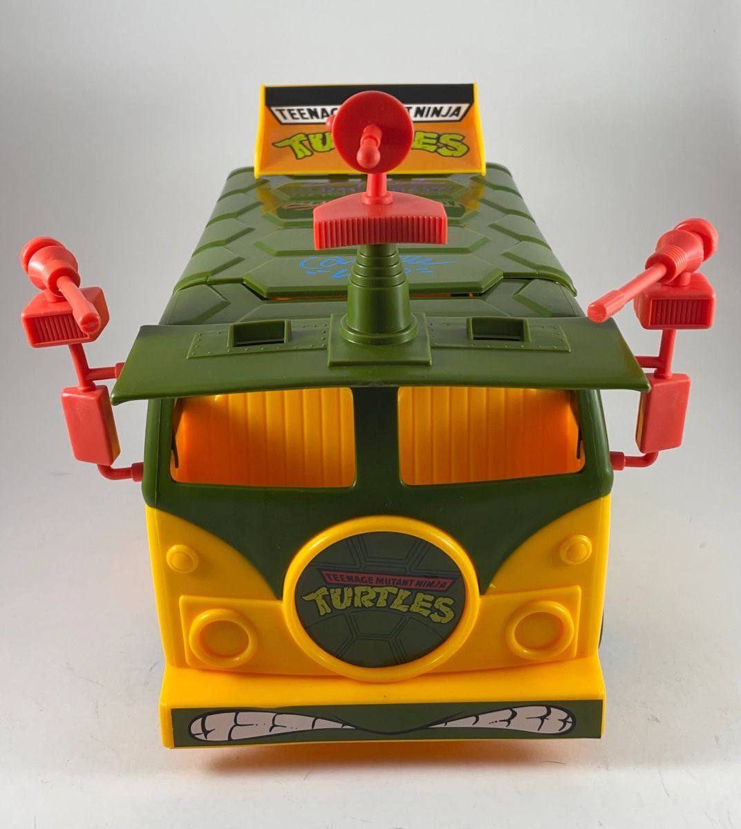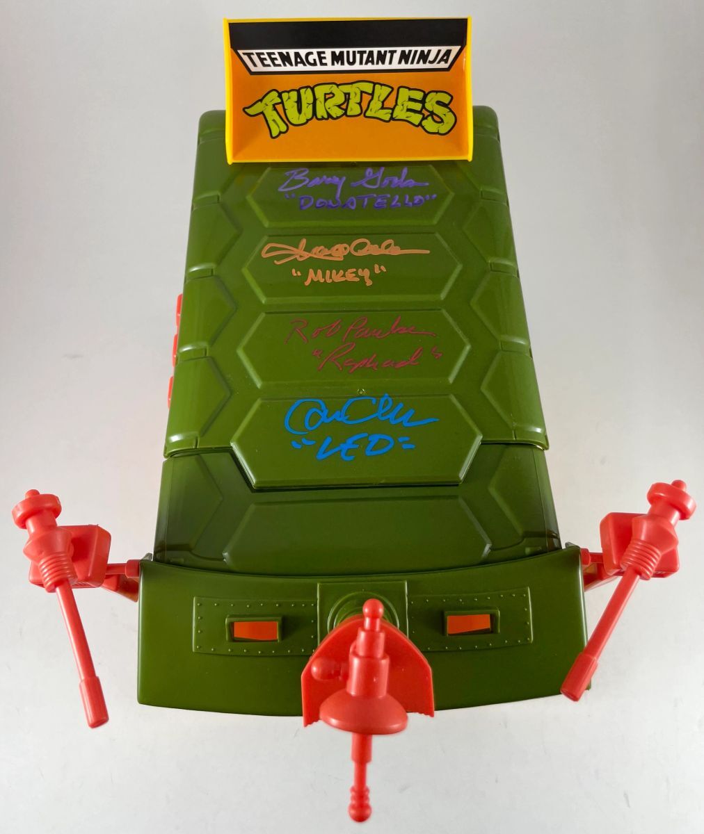 Teenage Mutant Ninja Turtles 2021 Playmates Party Wagon, hand signed by the four original Teenage Mutant Ninja Turtles voice actors. Cam Clarke, the voice of Leonardo signed and added character name “Leo” in a Blue Decco paint pen. Barry Gordon, the voice of Donatello, signed and added character name “Donatello” in a Purple Molotow paint pen. Townsend Coleman, the voice of Michelangelo, signed and added character name “Mikey” in an Orange Decco Paint pen. Rob Paulsen, the voice of Raphael, signed and added character name “Raphael” in a Red Molotow paint pen. A lot of love went in to this absolutely beautiful collectible. This is the rereleased 2021 Playmates Party Wagon, which is nearly identical to the original Playmates Party Wagon. Item is complete with all accessories and will ship with the original box. Item has been authenticated by James Spence Authentications, and includes the JSA Certificate of Authenticity Card.