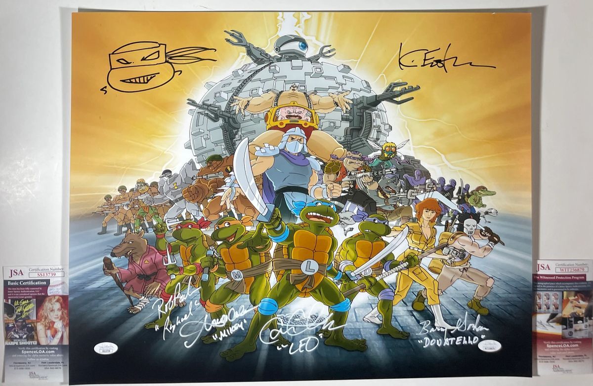 Professionally printed Teenage Mutant Ninja Turtles 16×20 photo, hand signed by five members of the cast, including Teenage Mutant Ninja Turtles creator Kevin Eastman and all four of the original TMNT voice actors… Rob Paulsen, Cam Clarke, Barry Gordon, and Townsend Coleman. This is five clean, perfectly placed signatures that really pop off of this crisp, professionally printed 16×20 photo. Mr. Eastman signed and added a Turtle Head sketch in a Black 2 MM paint pen. Rob Paulsen signed and added character name “Raphael” in a 2 MM white paint pen. Cam Clarke signed and added character name “Leo” in a 2 MM white paint pen. Barry Gordon signed and added character name “Donatello” in a 2 MM white paint pen. Townsend Coleman signed and added character name “Mikey” in a 2 MM white paint pen. Cam, Barry, Townsend, and Rob’s signatures have been authenticated by James Spence Authentications, while Kevin Eastman’s signature was witnessed by JSA. Both certificate of authenticity cards are included. Kevin Eastman JSA Witness COA# WIT256879 Original 4 Turtles JSA COA# SS13739