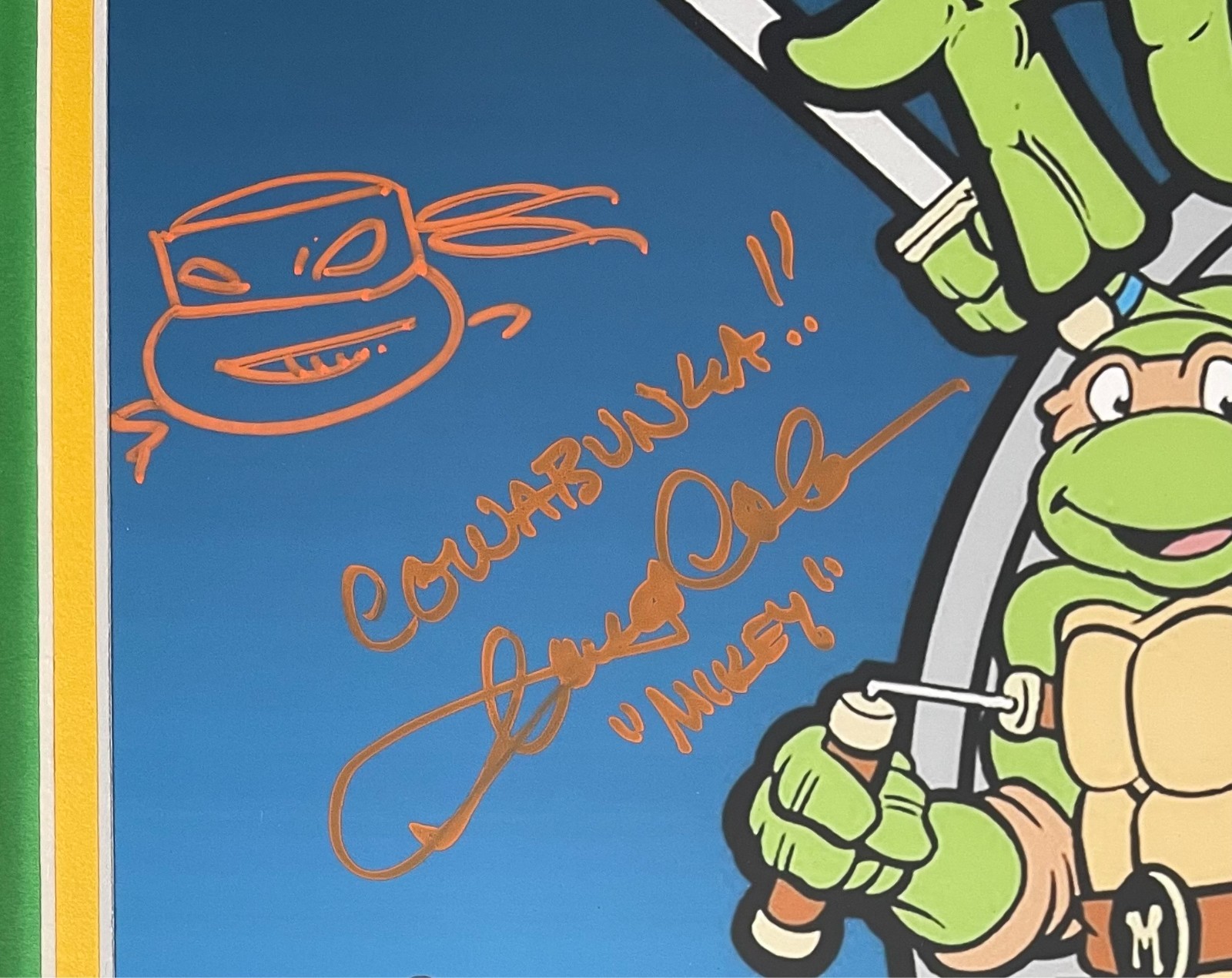 Original four Teenage Mutant Ninja Turtles (TMNT) Professionally Framed, Matted, and signed 11×17 Photo Display.  This absolutely beautiful, lab printed, Teenage Mutant Ninja Turtles 11×17 photo was hand signed, in person by the following six cast members from the iconic animated Television Series.