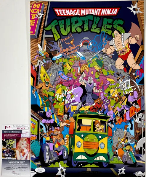 Professionally printed Teenage Mutant Ninja Turtles 11×17 poster, hand signed in person by the four original Teenage Mutant Ninja Turtles voice actors Rob Paulsen (Raphael), Cam Clarke (Leonardo), Barry Gordon (Donatello), and Townsend Coleman (Michelangelo). This is four clean, perfectly placed signatures that really pop off of this crisp, professionally printed Teenage Mutant Ninja Turtles (TMNT) 11×17 poster. Rob Paulsen signed and added character name “Raph” in White Paint Pen. Cam Clarke signed and added character name “Leo” in a flowing Blue 2MM Decco Paint Pen. Barry Gordon signed and added character name “Don” in a White Paint Pen. Townsend Coleman signed and added character name “Mikey” as well as writing “Pizza” with an arrow pointing to the pizza in a flowing Orange 2MM Paint Pen. Item has been authenticated by James Spence Authentications, one of the most reputable third-party authentication companies in the world, and includes the JSA Certificate of Authenticity card. JSA COA# SS13678