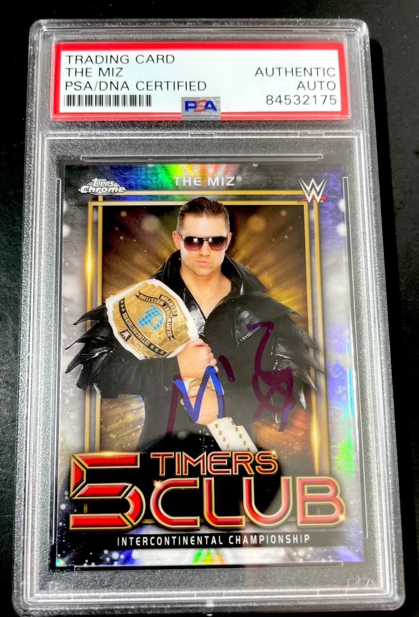 The Miz 2021 Topps Chrome WWE 5 Timers Club Trading Card #4, hand signed in person by two-time WWE Grand Slam Champion, The Miz Mike Mizanin. This is a clean, well placed on card signature, that really pops off of this 2021 Topps WWE Trading Card. Item has been authenticated and slabbed / encapsulated by PSA/DNA. PSA/DNA COA# 84532175