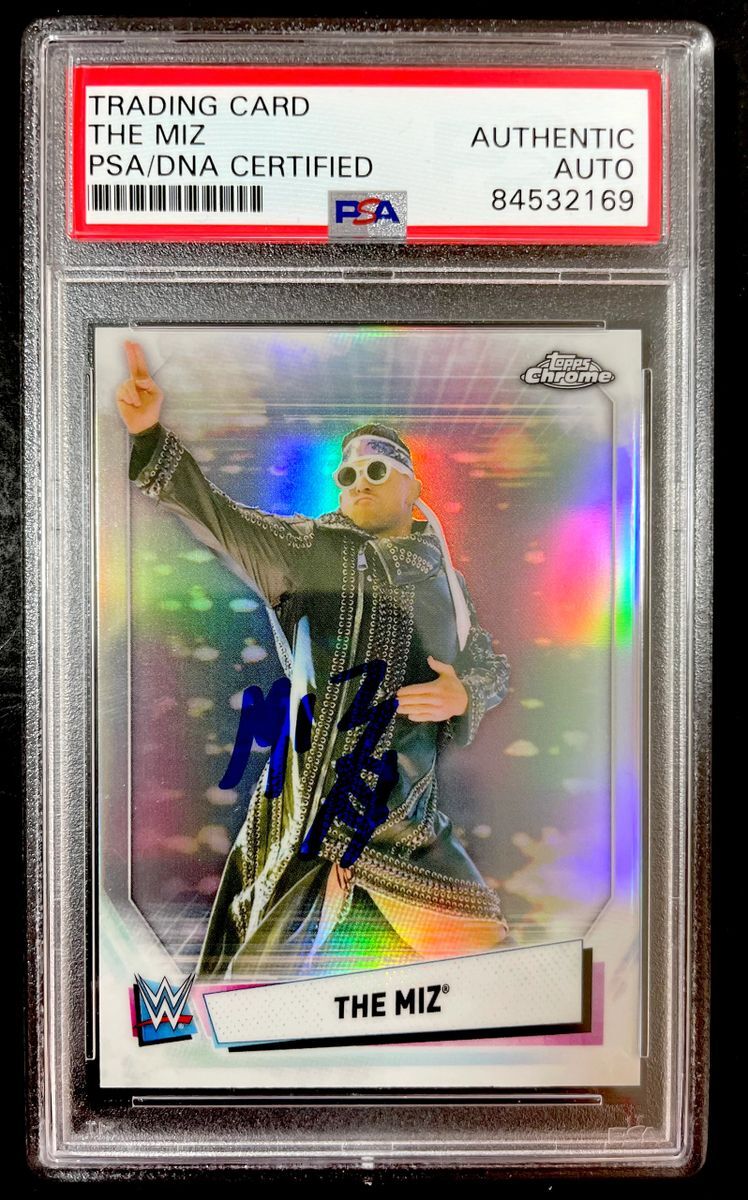 The Miz 2021 Topps Chrome WWE Trading Card #44, hand signed in person by two-time WWE Grand Slam Champion, The Miz Mike Mizanin. This is a clean, well placed on card signature, that really pops off of this 2021 Topps Chrome WWE Trading Card. Item has been authenticated and slabbed / encapsulated by PSA/DNA. PSA/DNA COA# 84532169