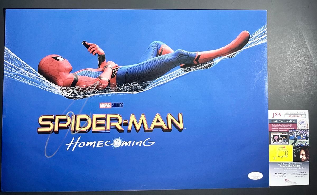 Professionally printed Spider-Man Homecoming 12×18 movie poster, hand signed by actor Tom Hardy who plays Eddie Brock AKA Venom in the Venom films. Tom Hardy is also known for his role as Bane in The Dark Knight Rises. This is a clean, well placed signature on this crisp, professionally printed 12×18 movie poster. Item has been authenticated by James Spence Authentications, and includes the JSA Certificate Of Authenticity card.