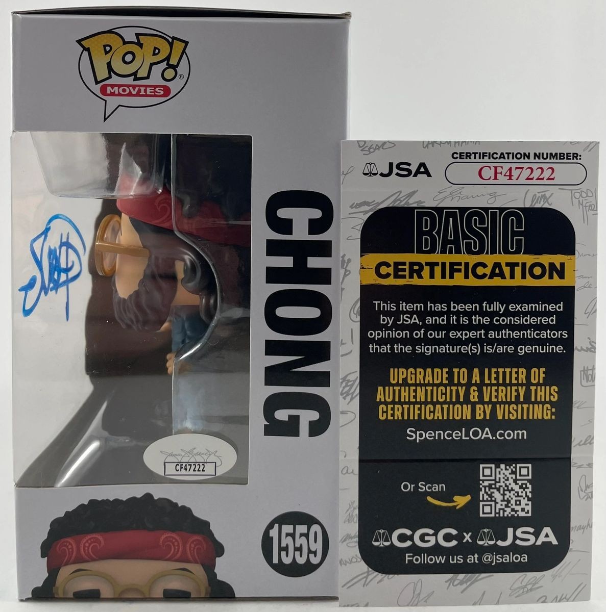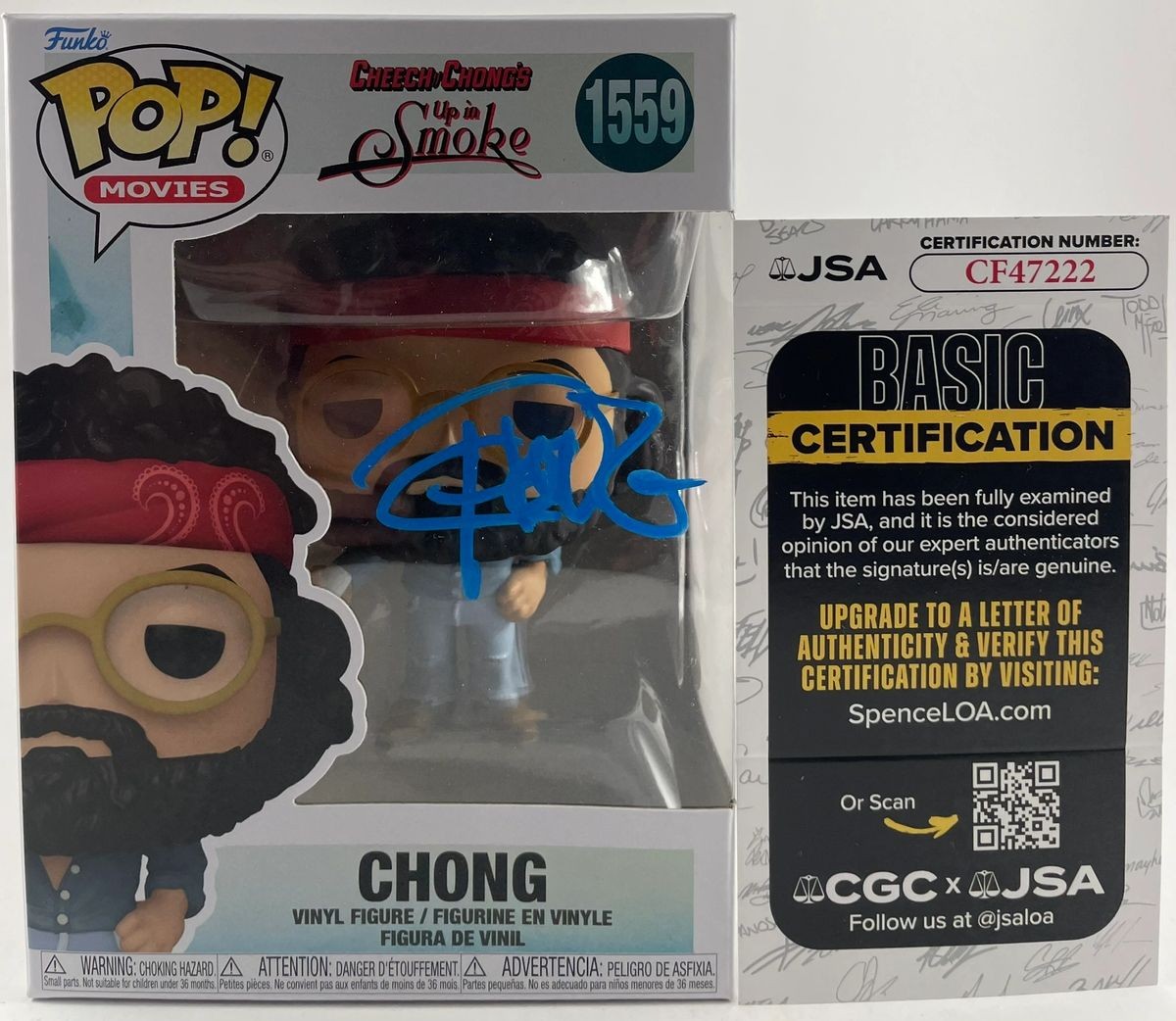 Cheech & Chong’s Up In Smoke Chong Funko POP! Vinyl Figure #1559, hand signed in person by actor Tommy Chong who played the role of Chong in the 1978 comedy Cheech & Chong’s Up In Smoke. This is a clean, well placed signature, signed in a flowing Blue 2MM DECCO Paint Pen that really pops off of the plastic. A clear plastic EcoTEK Funko POP protector is included with purchase to safely ship the Funko inside of. Item has been authenticated by James Spence Authentications, one of the most reputable third-party authentication companies in the world, and includes the JSA Certificate of Authenticity card. JSA COA# CF47222