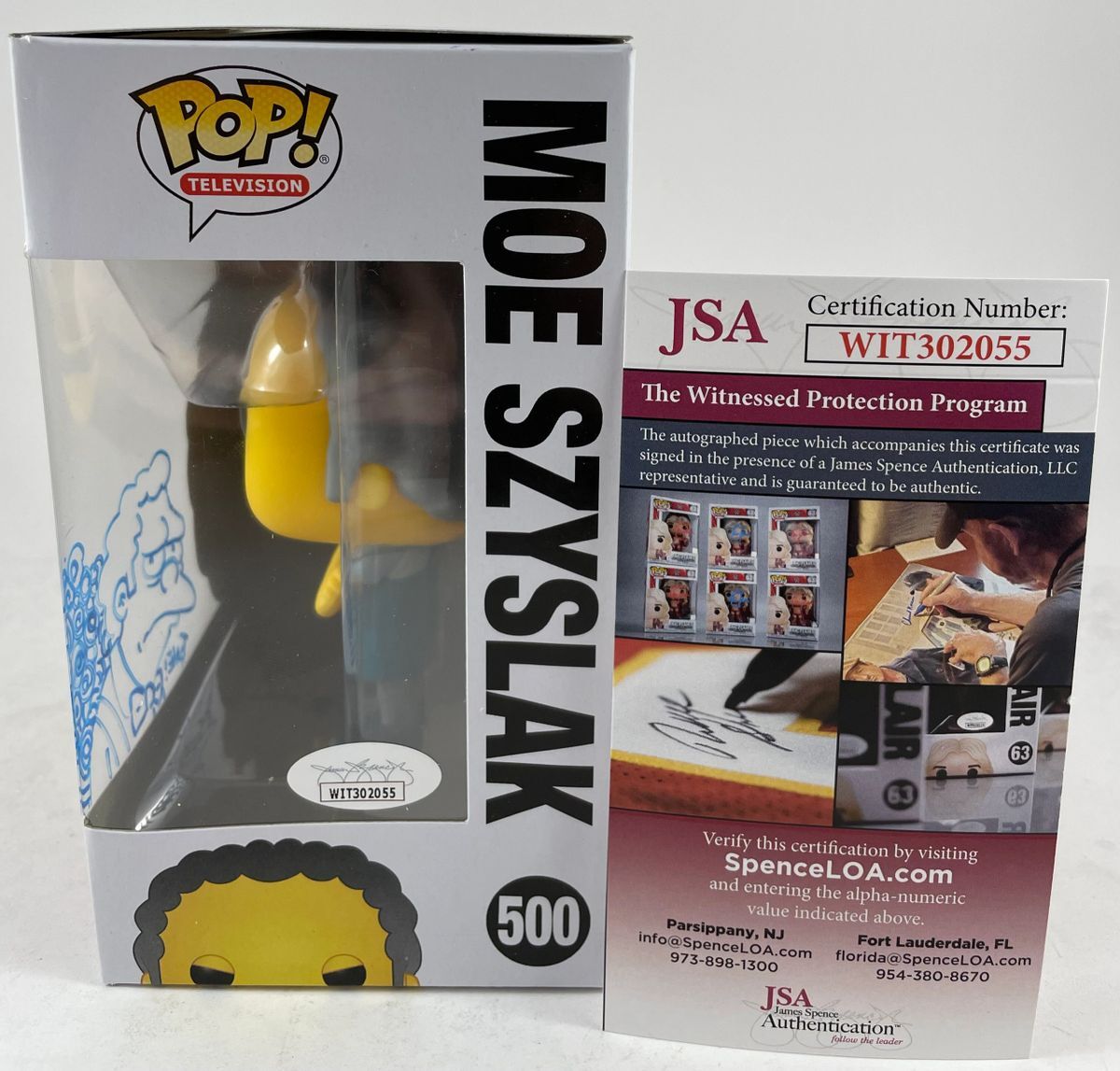 The Simpsons Moe Syzslak Funko POP! Vinyl Figure #500, hand signed and sketched in person by insanely talented The Simpsons comic book artist, Tone Rodriguez. This is a clean, well placed signature, with a Moe Syzslak sketch, signed in a flowing Blue 2MM Decco Paint Pen that really pops off of the plastic. Item was witnessed being signed by James Spence Authentications, one of the most reputable third party authentication companies in the world, and includes the JSA Witness Certificate of Authenticity card. JSA COA# WIT302055