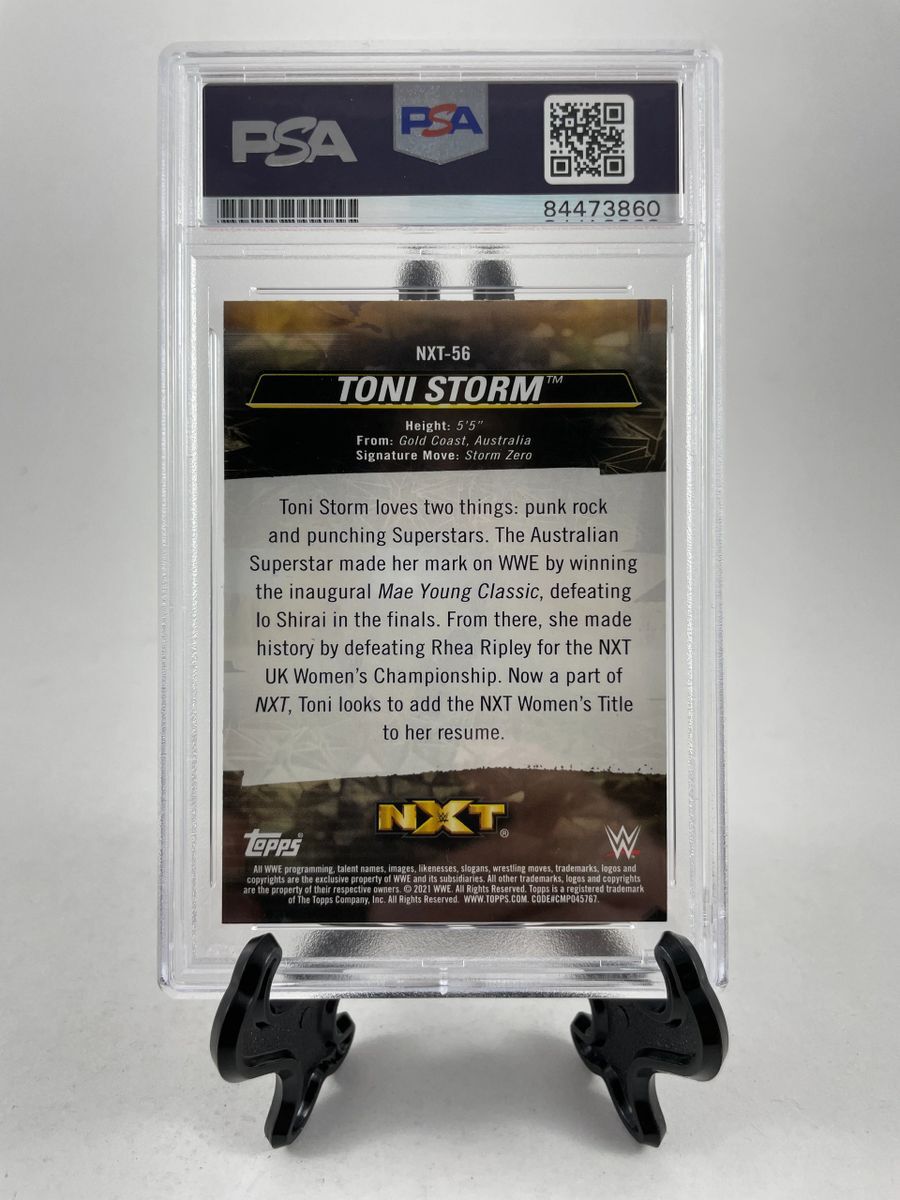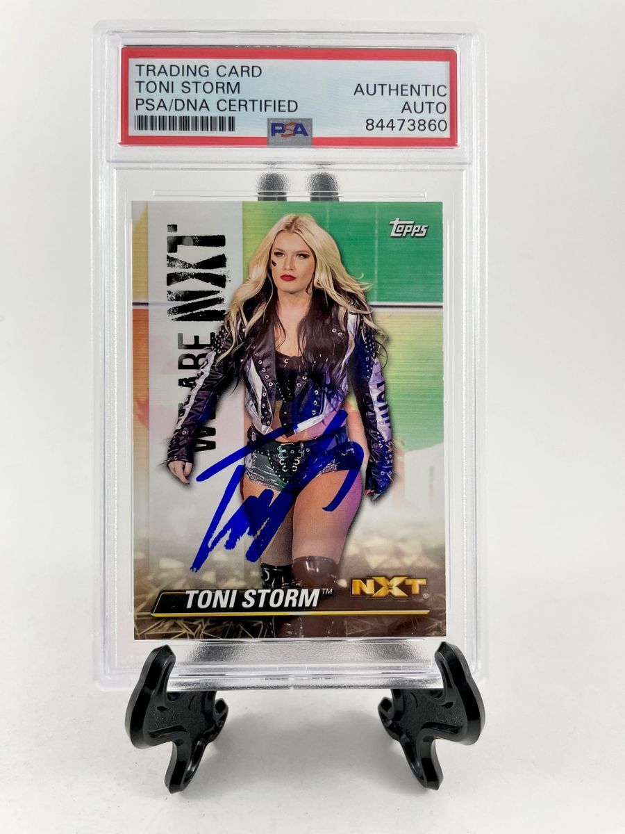 Toni Storm 2021 Topps WWE We Are NXT Trading Card #NXT-56, hand signed in person by former WWE NXT Women’s Champion, Toni Storm. Toni currently wrestles for All Elite Wrestling (AEW) under the ring name “Timeless” Toni Storm where she is a former AEW Women’s Champion. This is a clean, well placed on card signature, that really pops off of this 2021 Topps WWE We Are NXT Trading Card. Stand is for display purposes only and is not included. Item has been authenticated and slabbed by PSA/DNA. PSA/DNA COA# 84473860