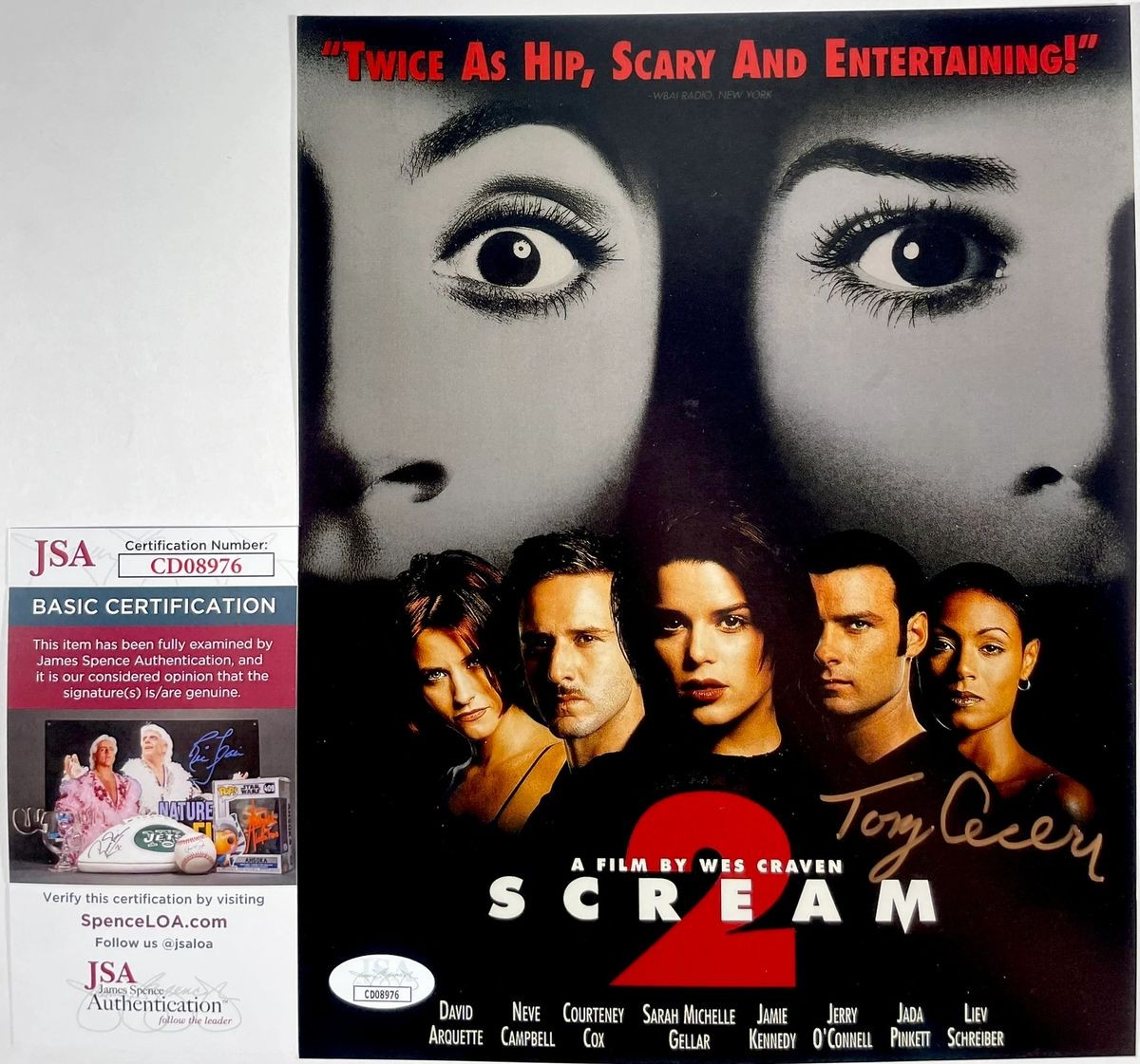 Professionally printed SCREAM 2 8×10 Mini Movie Poster Photo, hand signed in person by actor and stunt double Anthony Tony Cecere who played the role of Ghostface in multiple scenes in the first two SCREAM films. This is a clean, well placed signature, signed in a flowing Bronze that really pops off of this crisp, professionally printed SCREAM 2 8×10 Mini Movie Poster Photo. A clear plastic 8×10 toploader is included with purchase to safely ship the photo inside of. Item has been authenticated by James Spence Authentications, one of the most reputable third-party authentication companies in the world and includes the JSA Certificate of Authenticity card.
