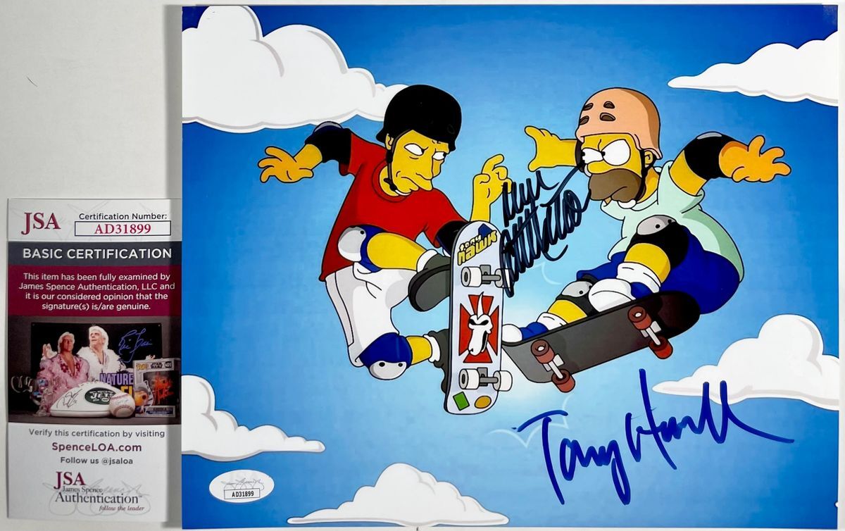 Professionally printed 8×10 photo, hand signed in person by skateboarding legend Tony Hawk and the voice of popular Simpsons character Homer Simpson, Dan Castellaneta. This is two clean, well placed signatures that really pop off of this crisp, professionally printed 8×10 photo. Item has been authenticated by James Spence Authentications, one of the most reputable third party authentication companies in the world, and includes the JSA Certificate of Authenticity card. JSA COA# AD31899