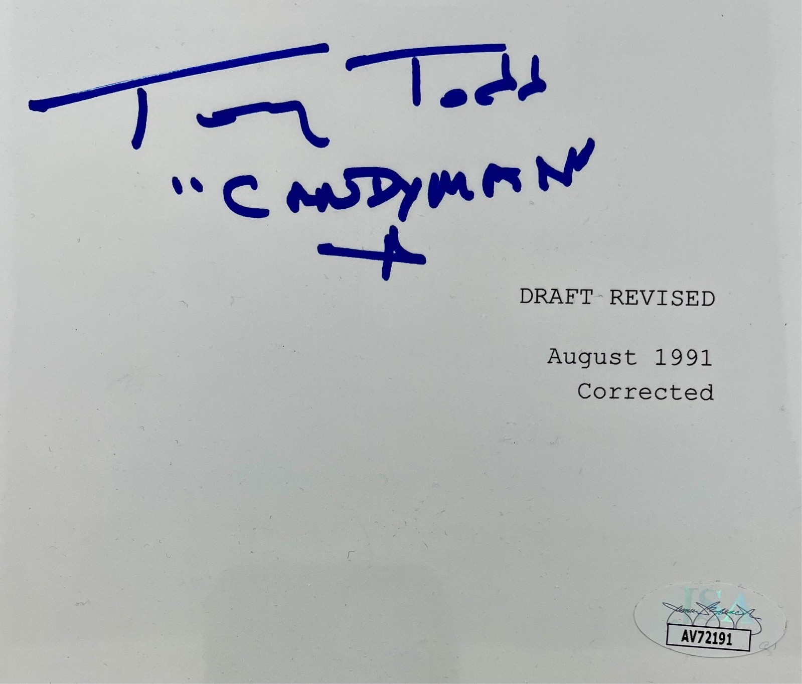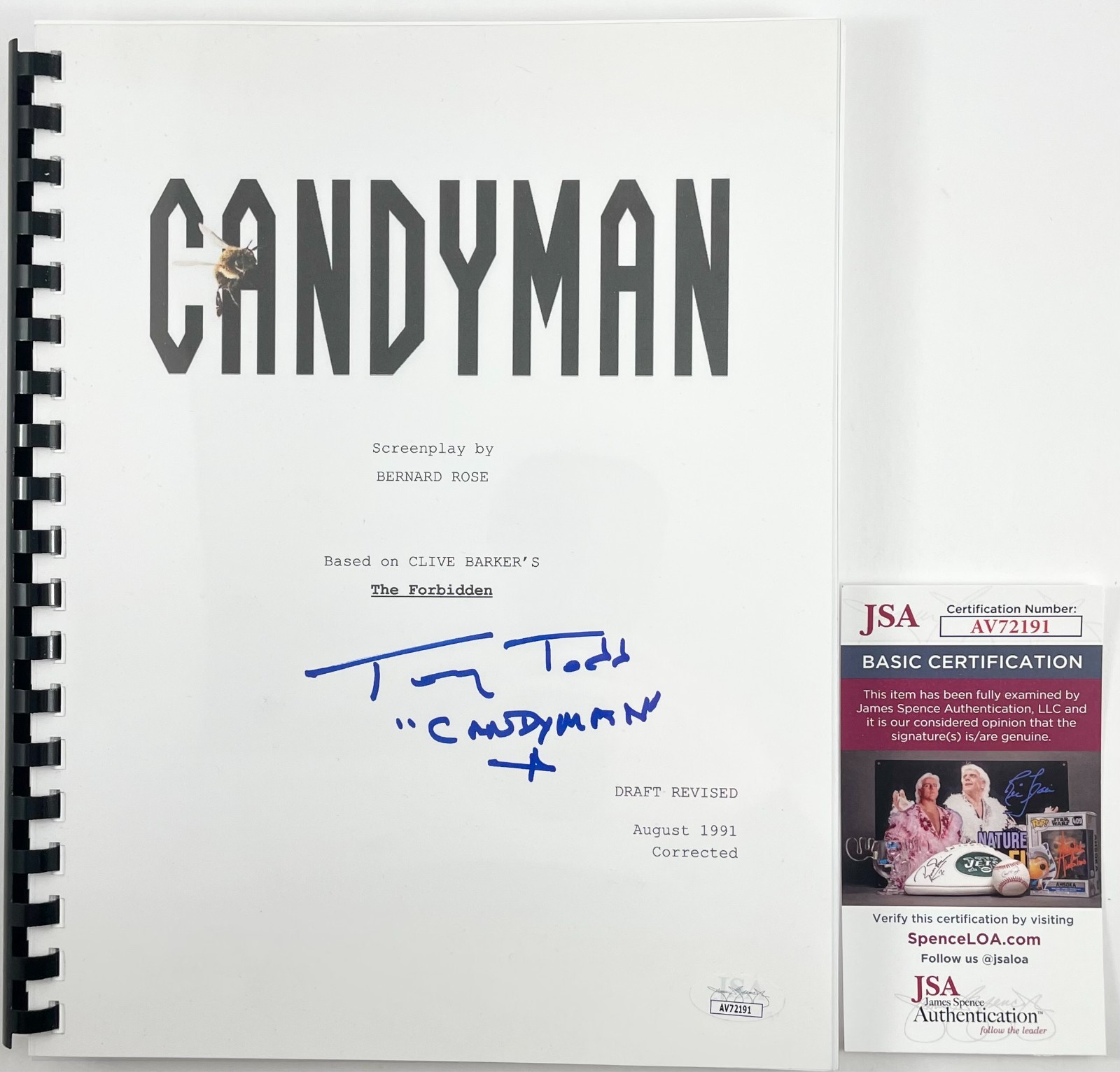 Professionally bound, Candyman complete movie script, hand signed in person by the late great Horror Icon Tony Todd, who played the role of Daniel Robitaille aka The Candyman in the 1993 film Candyman, as well as the sequels. This is a clean, well placed signature, with character name “Candyman” inscription signed in a flowing Blue Sharpie that really pops off of the cover of this Candyman full movie script.  Script is complete, professionally bound, and comes with a clear plastic protector. Clear on the front so you can display the script, and black on the back.   Item has been authenticated by James Spence Authentication, one of the most reputable third-party authentication companies in the world, and includes the JSA Certificate Of Authenticity card.