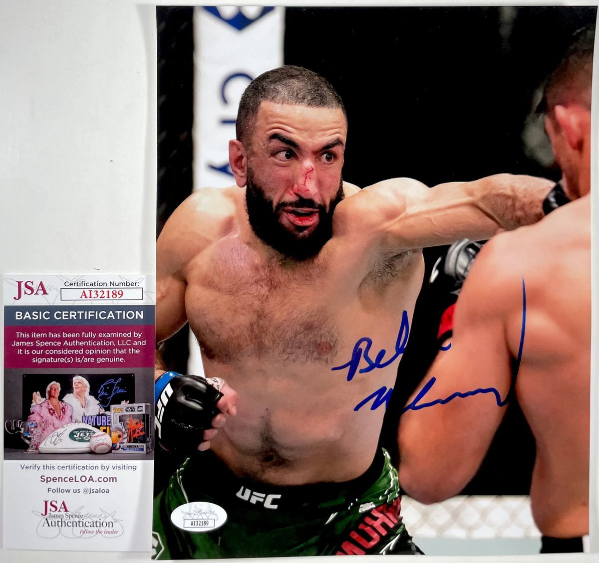 Professionally printed 8×10 photo, hand signed by UFC Welterweight Fighter, Belal Muhammad. This is a clean, well placed signature that really pops off of this crisp, professionally printed 8×10 photo. Item has been authenticated by James Spence Authentications, and includes the JSA Certificate of Authenticity card.