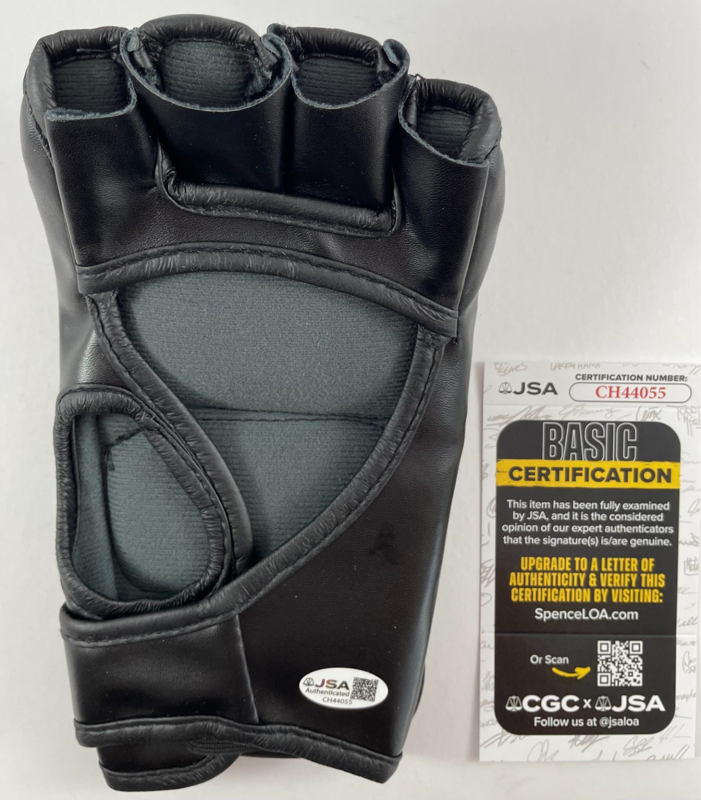 Black with White and Red lettering UFC MMA Glove, hand signed in person by the inaugural UFC Women’s Bantamweight Champion, “Rowdy” Ronda Rousey.  After her departure from the UFC, Ronda signed with the WWE, where she would go on to win the WWE Women’s World Championship three times.  This is a clean, well placed signature, signed in a flowing Pink 2MM Molotow Paint Pen that really pops off of this Black UFC MMA Glove.  Item has been authenticated by James Spence Authentication, one of the most reputable third-party authentication companies in the world, and includes the JSA Certificate of Authenticity card