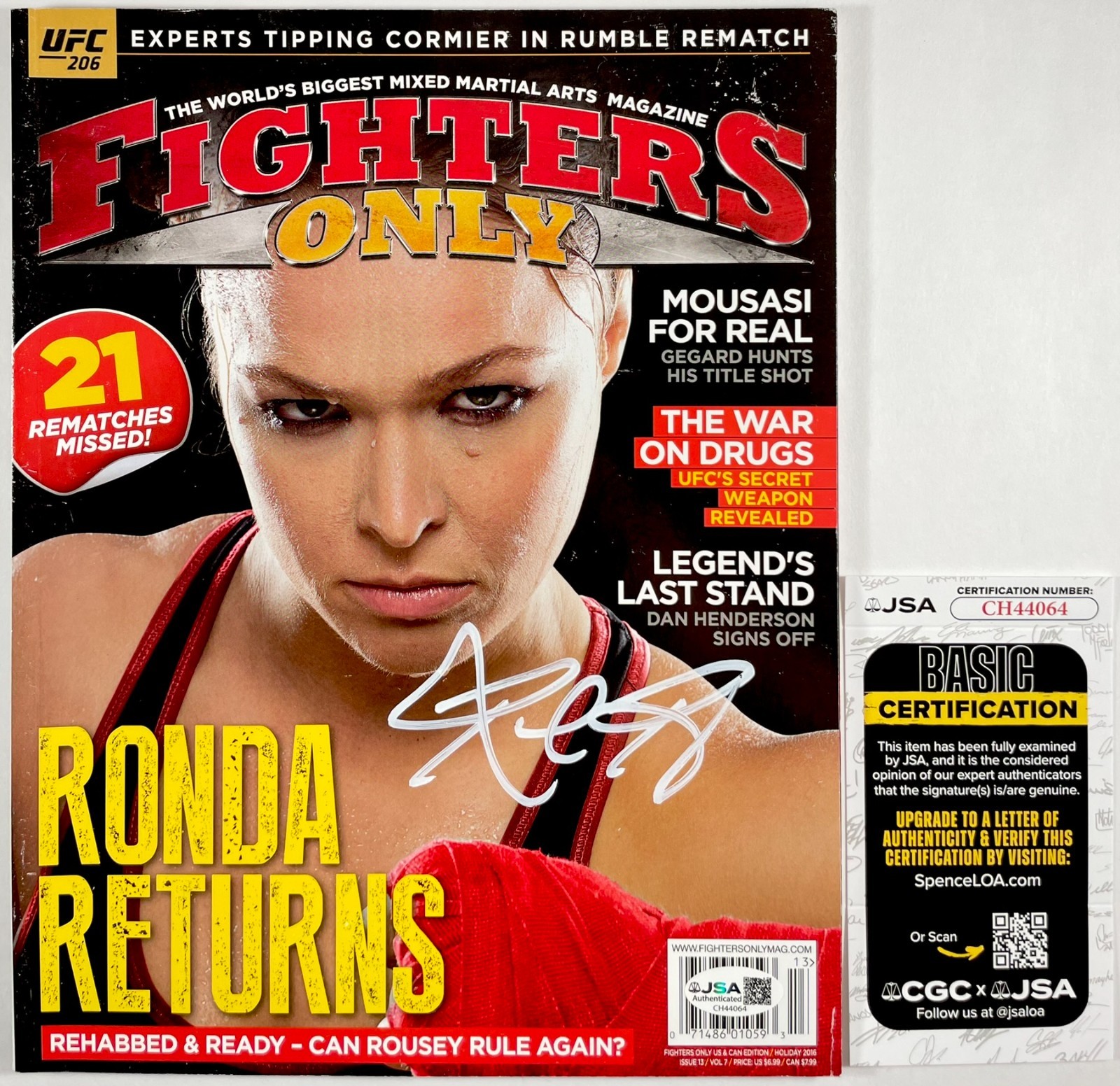 Fighters Only Magazine Holiday 2016 Issue 13 Vol 7, hand signed in person by inaugural UFC Women’s Bantamweight Champion, the Baddest Woman On The Planet, “Rowdy” Ronda Rousey. After her departure from the UFC, Ronda signed with the WWE, where she would go on to win the WWE Women’s World Championship three times. This is a clean, well placed signature, signed in a flowing, thick White DECCO Paint Pen that really pops off of this Fighters Only Holiday 2016 Magazine Cover. Magazine will ship inside of the same clear bag and white board it has been stored in since the day it was signed. Item has been authenticated by James Spence Authentications, one of the most reputable third-party authentication companies in the world, and includes the JSA Certificate of Authenticity card.