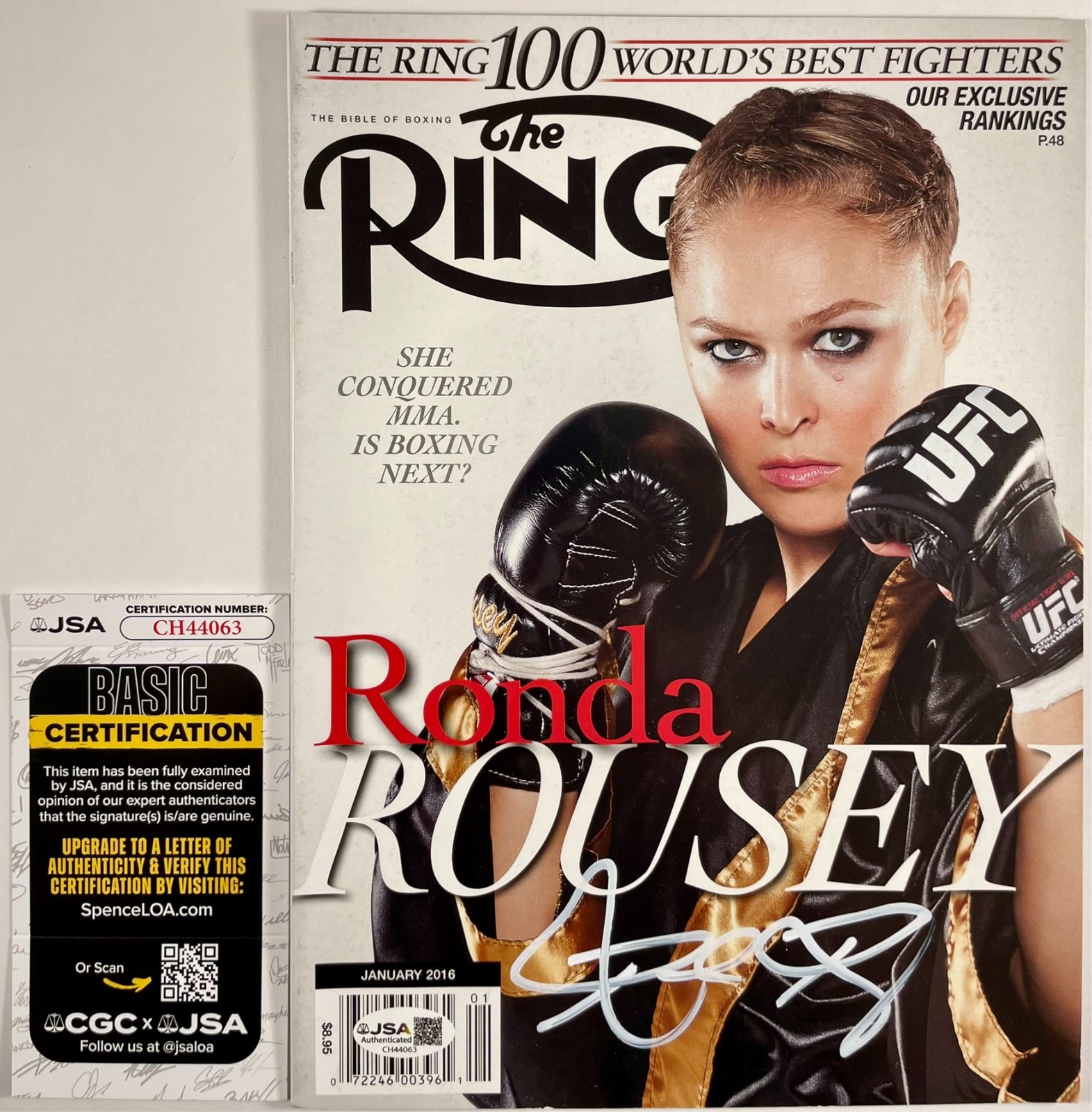 The Ring Magazine January 2016 The Ring 100 World’s Best Fighters Rankings Issue, hand signed in person by inaugural UFC Women’s Bantamweight Champion, the Baddest Woman On The Planet, “Rowdy” Ronda Rousey. After her departure from the UFC, Ronda signed with the WWE, where she would go on to win the WWE Women’s World Championship three times. This is a clean, well placed signature, signed in a flowing, thick White DECCO Paint Pen that really pops off of this The Ring January 2016 Magazine Cover. Magazine will ship inside of the same clear bag and white board it has been stored in since the day it was signed. Item has been authenticated by James Spence Authentications, one of the most reputable third-party authentication companies in the world, and includes the JSA Certificate of Authenticity card.