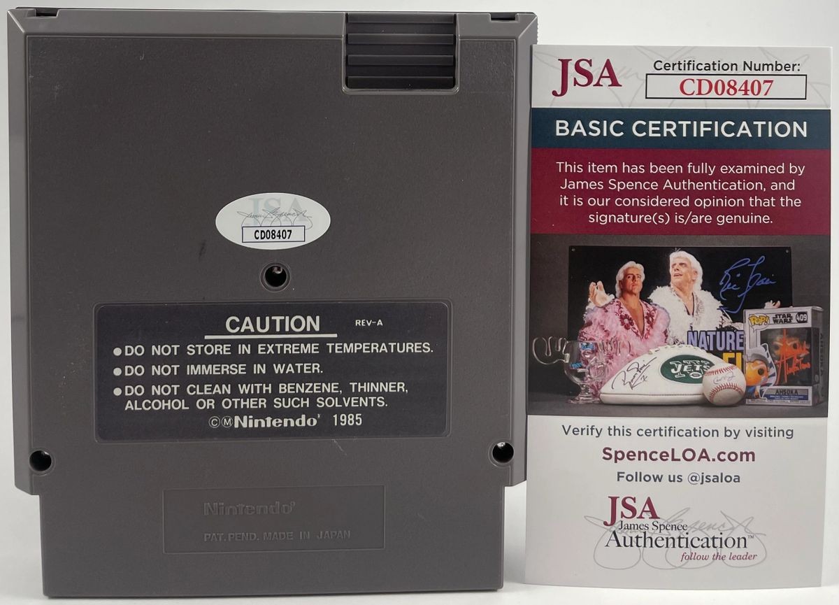 Wheel Of Fortune Featuring Vanna White Original Nintendo (NES) Video Game Cartridge, hand signed in person by Wheel Of Fortune co-host and former Playboy Cover Girl, the lovely Vanna White. This is a clean, well placed signature, signed in a flowing Black Sharpie that really pops off of the cover of this Wheel Of Fortune Featuring Vanna White NES Cartridge. Item has been authenticated by James Spence Authentications, one of the most reputable third-party authentication companies in the world and includes the JSA Certificate of Authenticity card.