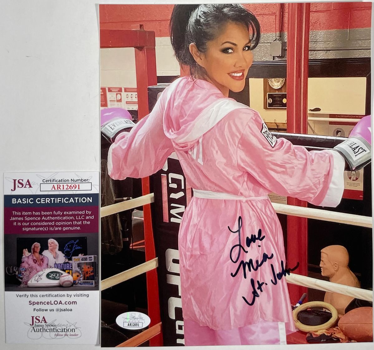 Professionally printed 8×10 photo, hand signed in person by former WBC Super Welterweight Champion, and Playboy Cover Girl, the lovely Mia St. John. This is a clean, well placed signature, signed in a flowing Back Sharpie that really pops off of this crisp, professionally printed 8×10 photo. Item has been authenticated by James Spence Authentications, one of the most reputable third party authentication companies in the world, and includes the JSA Certificate Of Authenticity card. JSA COA# AR12691