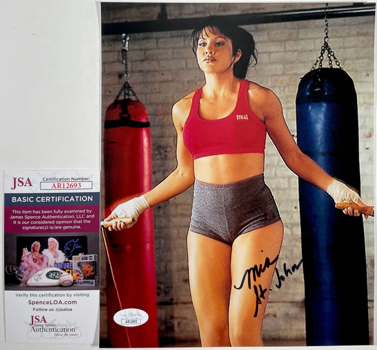 Professionally printed 8×10 photo, hand signed in person by former WBC Super Welterweight Champion, and Playboy Cover Girl, the lovely Mia St. John. This is a clean, well placed signature, signed in a flowing Back Sharpie that really pops off of this crisp, professionally printed 8×10 photo. Item has been authenticated by James Spence Authentications, one of the most reputable third party authentication companies in the world, and includes the JSA Certificate Of Authenticity card. JSA COA# AR12693