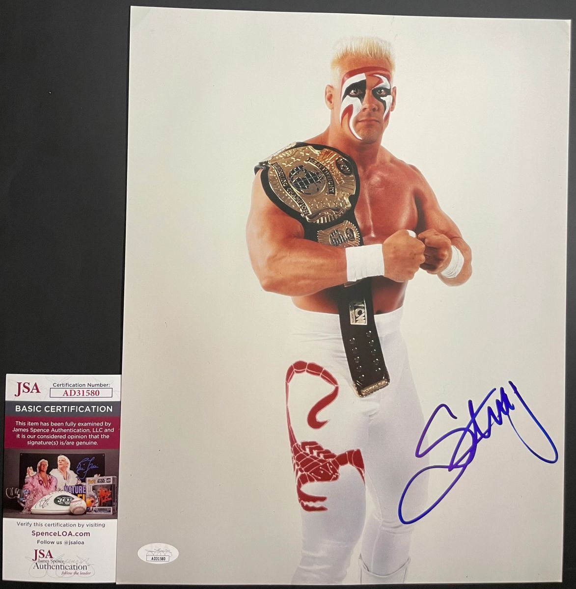 Professionally printed 11×14 photo, hand signed by WWE Hall Of Fame Superstar and six time WCW World Heavyweight Champion, Sting. Steve Borden AKA Sting also wrestled in TNA Impact Wrestling and currently is a member of All Elite Wrestling (AEW). This is a clean, well placed signature that really pops off of this crisp, professionally printed 11×14 photo. Item has been authenticated by James Spence Authentications, and includes the JSA Certificate Of Authenticity card. JSA COA# AD31580