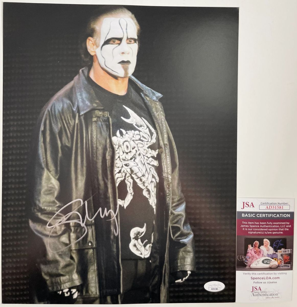 Professionally printed 11×14 photo, hand signed by WWE Hall Of Fame Superstar and six time WCW World Heavyweight Champion, Sting. Steve Borden AKA Sting also wrestled in TNA Impact Wrestling and currently is a member of All Elite Wrestling (AEW). This is a clean, well placed signature that really pops off of this crisp, professionally printed 11×14 photo. Item has been authenticated by James Spence Authentications, and includes the JSA Certificate Of Authenticity card.