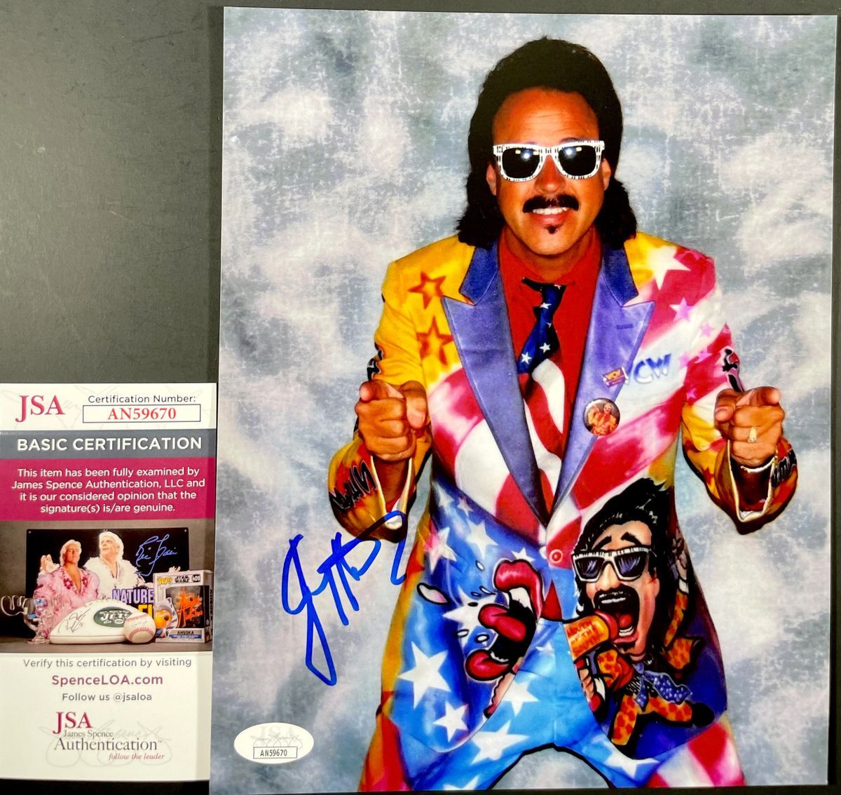 Professionally printed 8×10 photo, hand signed in person by WWE Hall Of Fame Manager, “The Mouth Of The South” Jimmy Hart. Jimmy is considered one of the greatest managers in the history of the business working in both the WWF and WCW and managing such superstars as Hulk Hogan, The Hart Foundation, The Mountie, The Earthquake, The Honky Tonk Man, and Money Inc just to name a few. This is a clean, well placed signature that really pops off of this crisp, professionally printed 8×10 photo. Item has been authenticated by James Spence Authentications, and includes the JSA Certificate Of Authenticity card. JSA COA# AN59670