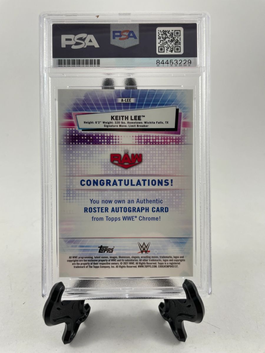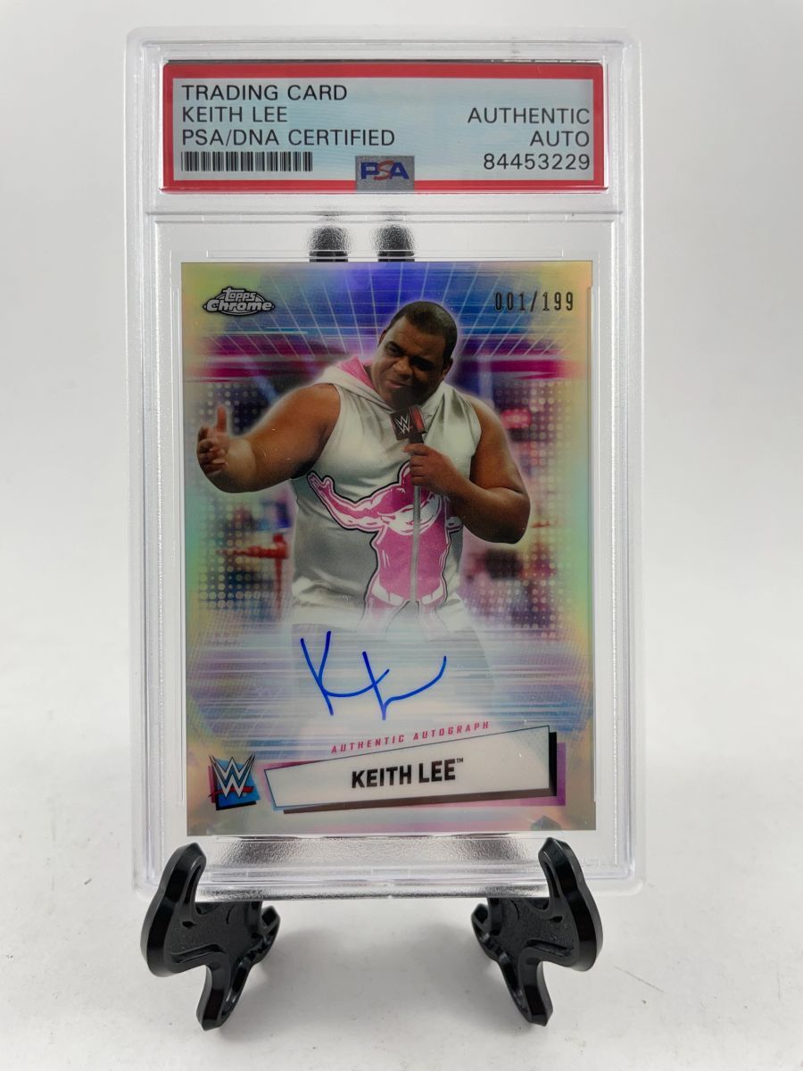 WWE 2021 Topps Chrome Keith Lee on card Autograph card number 001 of 199 made. This is a clean, perfectly placed signature that really pops off of this WWE 2021 Topps Chrome trading card. Stand is for display purposes only and is not included. Item has been authenticated and encapsulated by PSA/DNA, one of the most reputable third party authenticators in the industry.