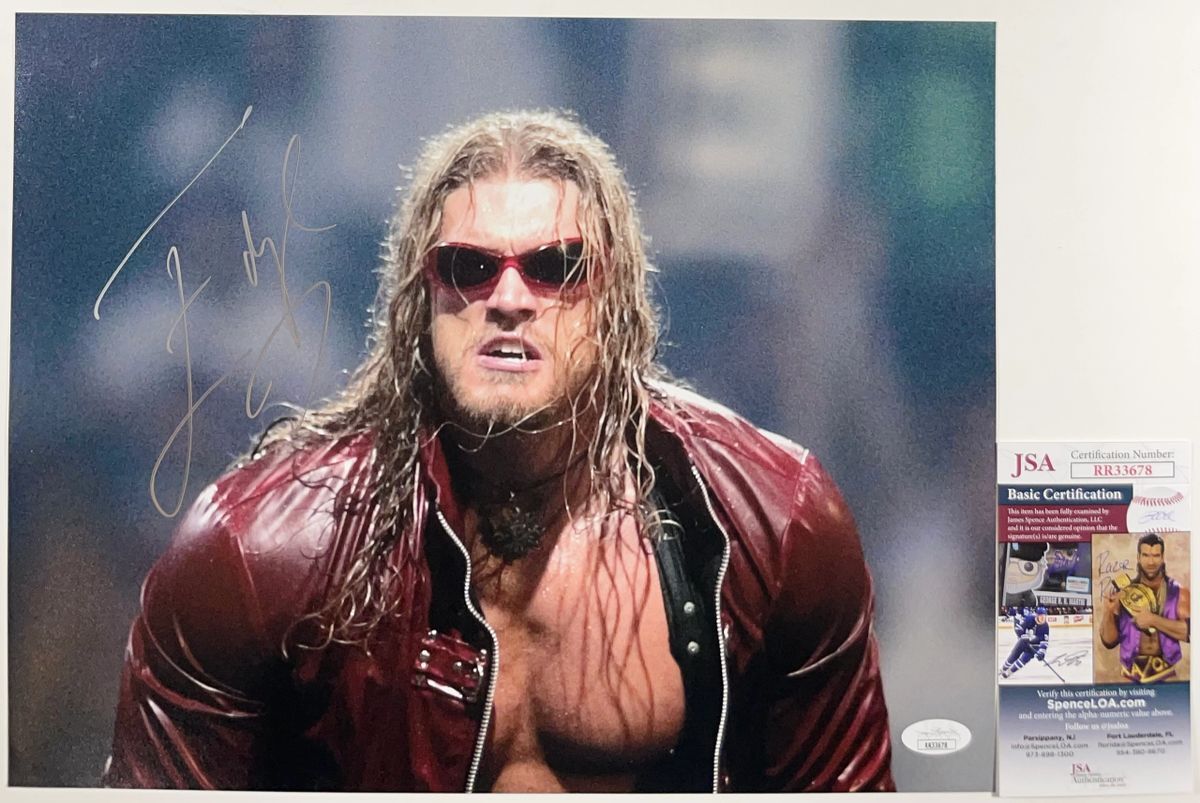 Professionally printed 11×14 photo, hand signed by WWE Hall Of Fame Superstar Edge. This is a clean, well placed signature that really pops off of this crisp, professionally printed 11×14 photo. Item has been authenticated by James Spence Authentications, and includes the JSA Certificate Of Authenticity card.