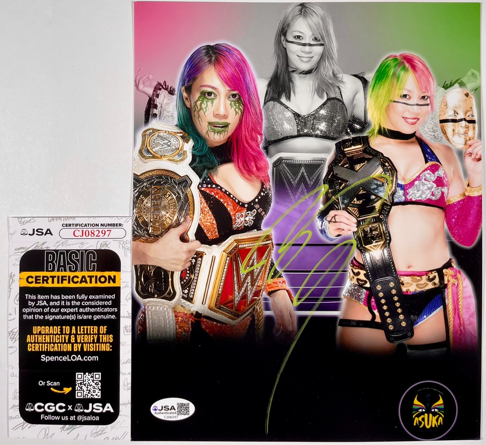 Professionally printed custom edit 8×10 photo, hand signed in person by WWE Women’s Triple Crown and Grand Slam Champion, “The Empress of Tomorrow” Asuka. Before coming to World Wrestling Entertainment (WWE), Asuka wrestled as Kana the Evil Murder Clown. Asuka along with her partner Kairi Sane make up the Tag Team of the Kabuki Warriors, and both women were part of the faction Damage CTRL. This is a clean, well placed signature, signed in a flowing Green 2MM Molotow Paint Pen that really pops off of this crisp, professionally printed custom edit 8×10 photo. A clear plastic 8×10 toploader is included with purchase to safely ship the photo inside of. Item has been authenticated by James Spence Authentication, one of the most reputable third-party authentication companies in the world, and includes the JSA Certificate Of Authenticity card.